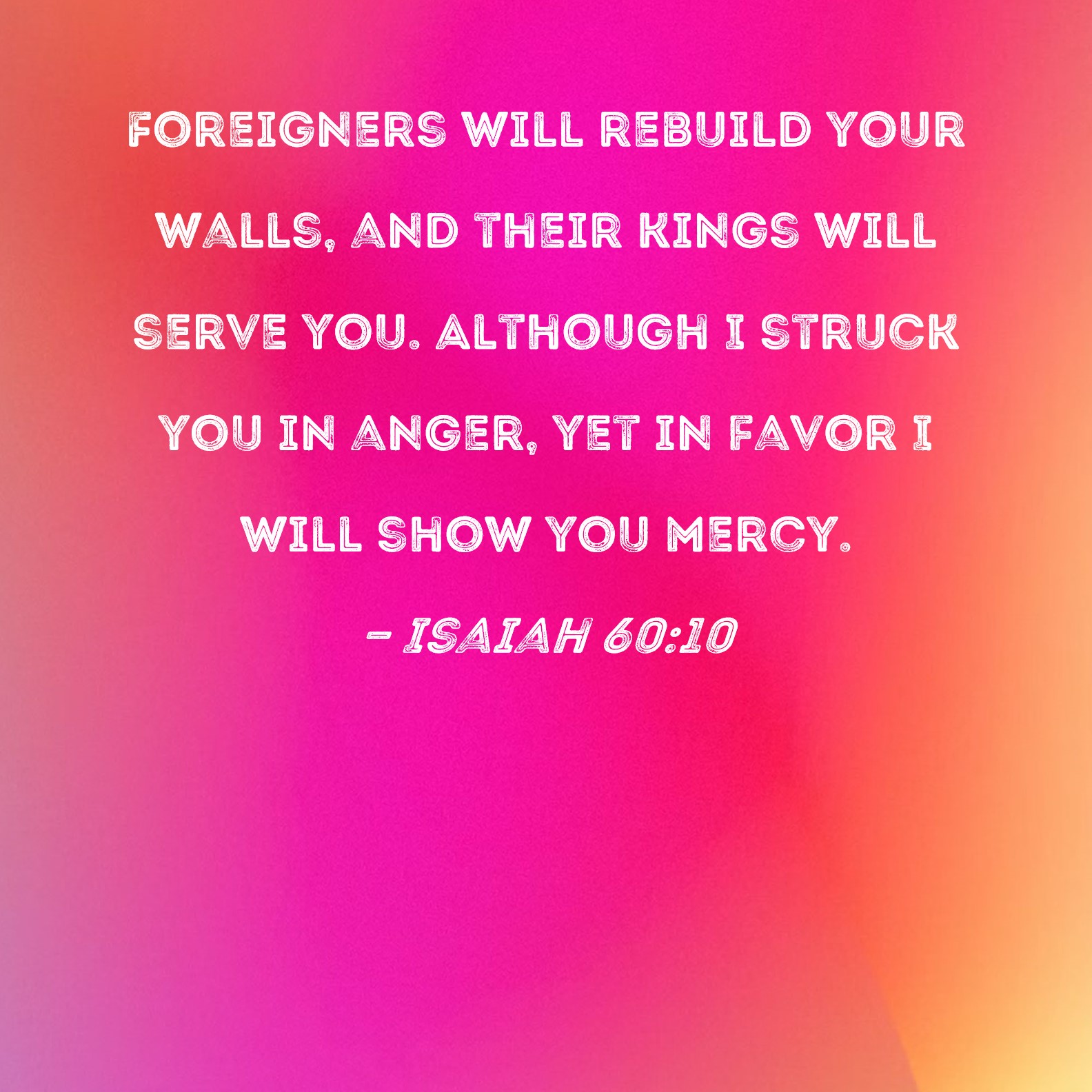 Isaiah 60:10 Foreigners will rebuild your walls, and their kings will serve you. Although I struck you in anger, yet in favor I will show you mercy.