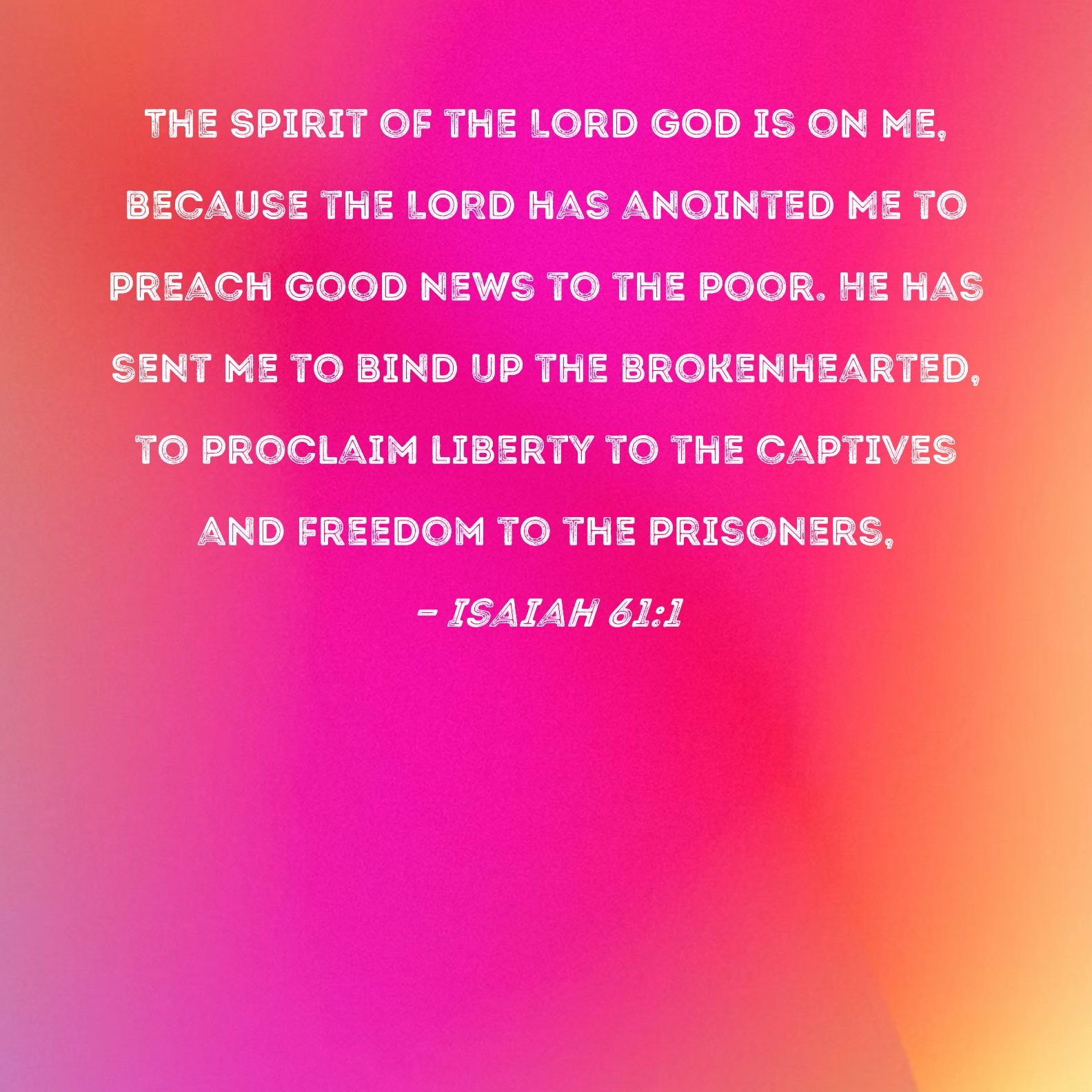 Isaiah 61:1 The Spirit of the Lord GOD is on Me, because the LORD has anointed Me to preach good news to the poor. He has sent Me to bind up the brokenhearted, to proclaim liberty to the captives and freedom to the prisoners,