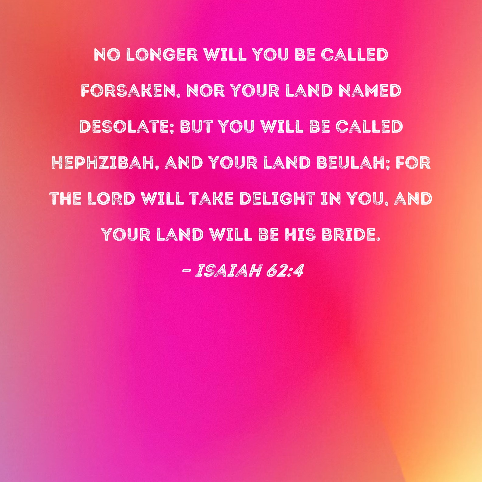 Isaiah 62:4 No longer will you be called Forsaken, nor your land named Desolate; but you will be called Hephzibah, and your land Beulah; for the LORD will take delight in you, and your land will be His bride.