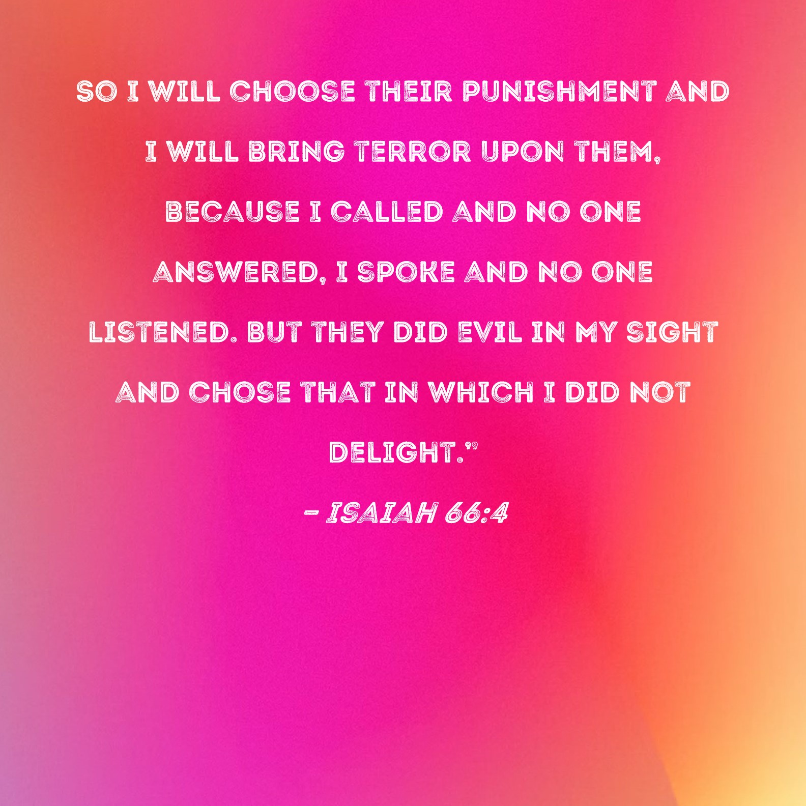 Isaiah 66:4 So I will choose their punishment and I will bring terror upon them, because I called and no one answered, I spoke and no one listened. But they did evil in My sight and chose that in which I did not delight."
