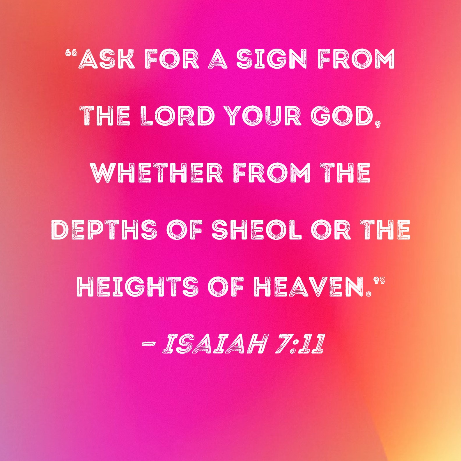 BSB: "Ask for a sign from the LORD your God, whether from the depths of Sheol or the heights of heaven." KJV: Ask thee a sign of the LORD thy God; ask it either in the depth, or in the height above. DRB: Ask thee a sign of the Lord thy God either unto the depth of hell, or unto the height above. DBT: Ask for thee a sign from Jehovah thy God; ask for it in the deep, or in the height above. ERV: Ask thee a sign of the LORD thy God; ask it either in the depth, or in the height above. WBT: Ask thee a sign from the LORD thy God; ask it either in the depth, or in the hight above. WEB: “Ask a sign of Yahweh your God; ask it either in the depth, or in the height above.” YLT: Ask for thee a sign from Jehovah thy God, Make deep the request, or make it high upwards.'Links Isaiah 7:11 NIV • Isaiah 7:11 NLT • Isaiah 7:11 ESV • Isaiah 7:11 NASB • Isaiah 7:11 KJV • Isaiah 7:11 Interlinear • Isaiah 7:11 Commentaries • Isaiah 7:11 Parallel Texts • Isaiah 7:11 Bible Apps • Isaiah 7:11 Parallel • Bible Hub |