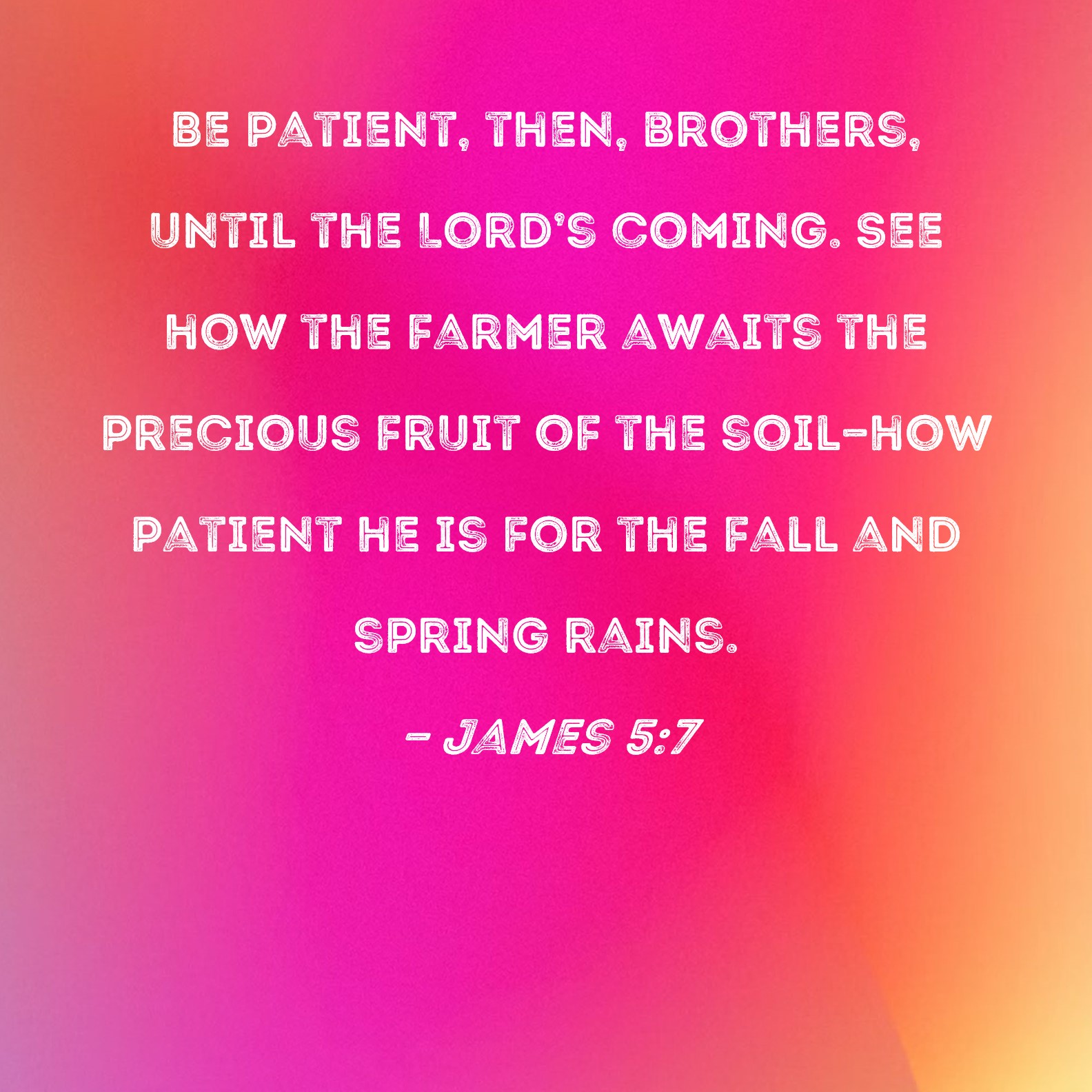 James 5:7 Be patient, then, brothers, until the Lord's coming. See how the farmer awaits the precious fruit of the soil--how patient he is for the fall and spring rains.