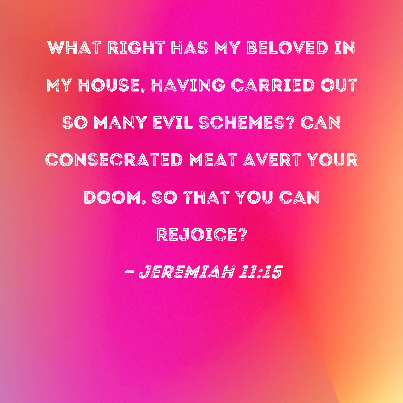 Jeremiah 11:15 What right has My beloved in My house, having carried out so many evil schemes? Can consecrated meat avert your doom, so that you can rejoice?