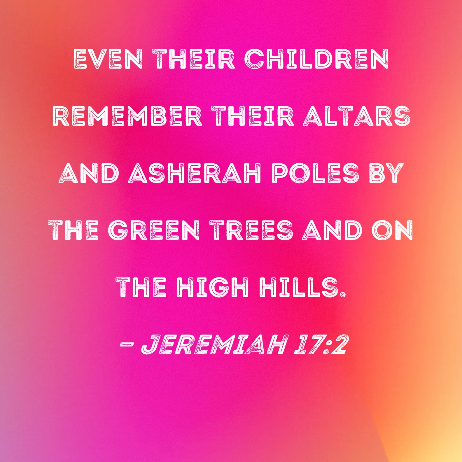 Jeremiah 17:2 Even their children remember their altars and Asherah poles by the green trees and on the high hills.