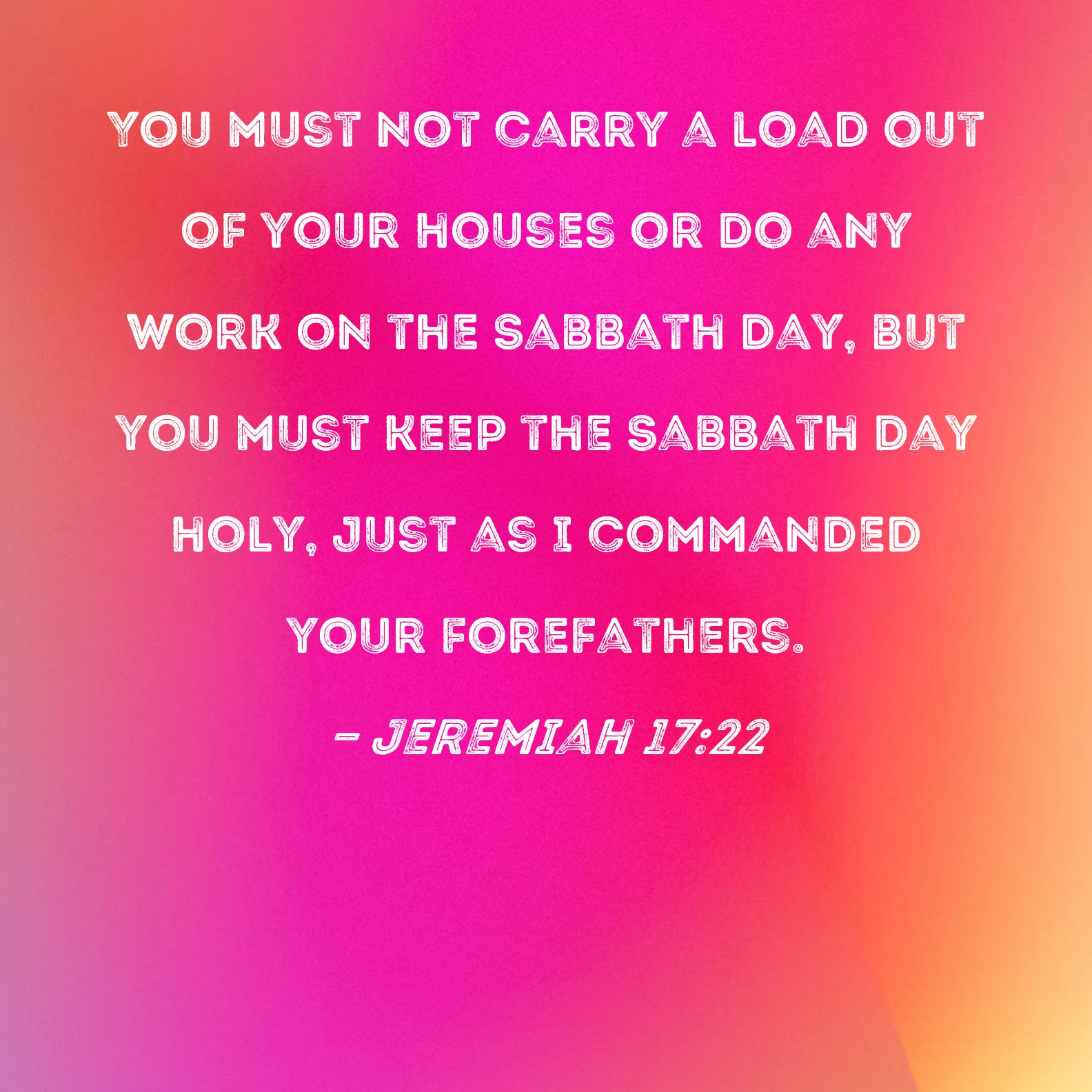BSB: You must not carry a load out of your houses or do any work on the Sabbath day, but you must keep the Sabbath day holy, just as I commanded your forefathers. KJV: Neither carry forth a burden out of your houses on the sabbath day, neither do ye any work, but hallow ye the sabbath day, as I commanded your fathers. DRB: And do not bring burdens out of your houses on the sabbath day, neither do ye any work: sanctify the sabbath day, as I commanded your fathers. DBT: and carry forth no burden out of your houses on the sabbath day, neither do any work; but hallow ye the sabbath day, as I commanded your fathers, ERV: neither carry forth a burden out of your houses on the sabbath day, neither do ye any work: but hallow ye the sabbath day, as I commanded your fathers; WBT: Neither carry forth a burden out of your houses on the sabbath day, neither do ye any work, but hallow ye the sabbath day, as I commanded your fathers. WEB: Don’t carry a burden out of your houses on the Sabbath day. Don’t do any work, but make the Sabbath day holy, as I commanded your fathers. YLT: Nor do ye take out a burden from your houses on the day of rest, Yea, any work ye do not do, And ye have sanctified the day of rest, As I have commanded your fathers.Links Jeremiah 17:22 NIV • Jeremiah 17:22 NLT • Jeremiah 17:22 ESV • Jeremiah 17:22 NASB • Jeremiah 17:22 KJV • Jeremiah 17:22 Interlinear • Jeremiah 17:22 Commentaries • Jeremiah 17:22 Parallel Texts • Jeremiah 17:22 Bible Apps • Jeremiah 17:22 Parallel • Bible Hub |