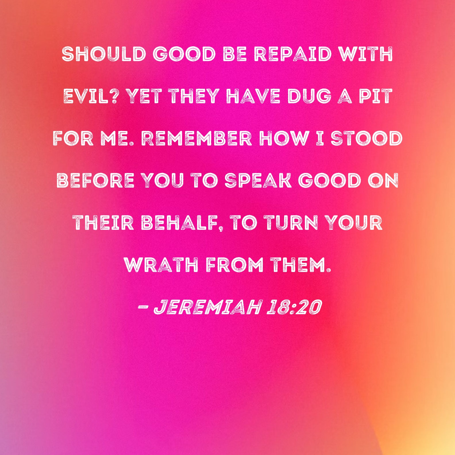 Jeremiah 18:20 Should good be repaid with evil? Yet they have dug a pit for me. Remember how I stood before You to speak good on their behalf, to turn Your wrath from them.