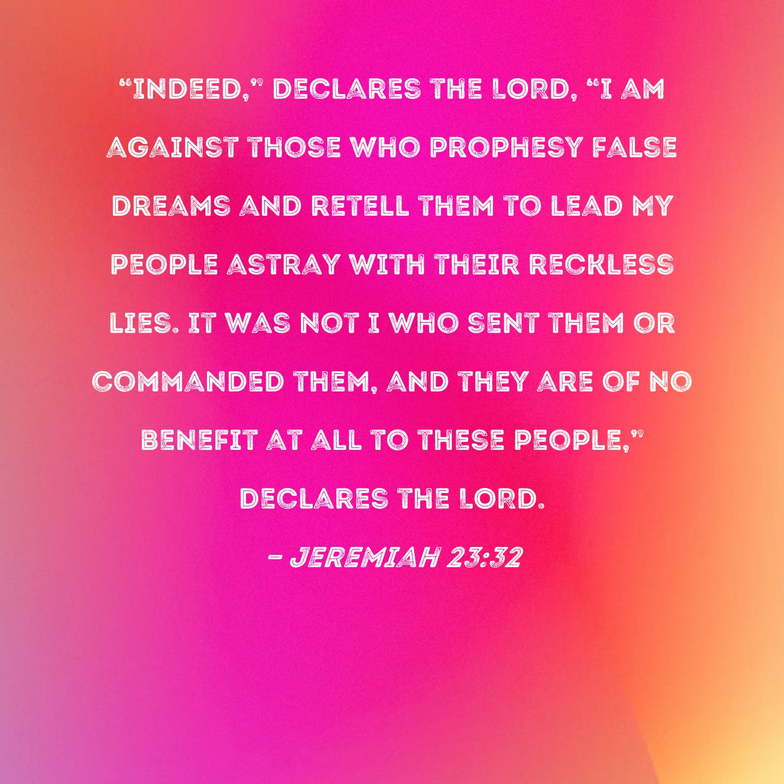 Jeremiah 23:32 "Indeed," declares the LORD, "I am against those who prophesy false dreams and retell them to lead My people astray with their reckless lies. It was not I who sent them or commanded them, and they are of no benefit at all to these people," declares the LORD.