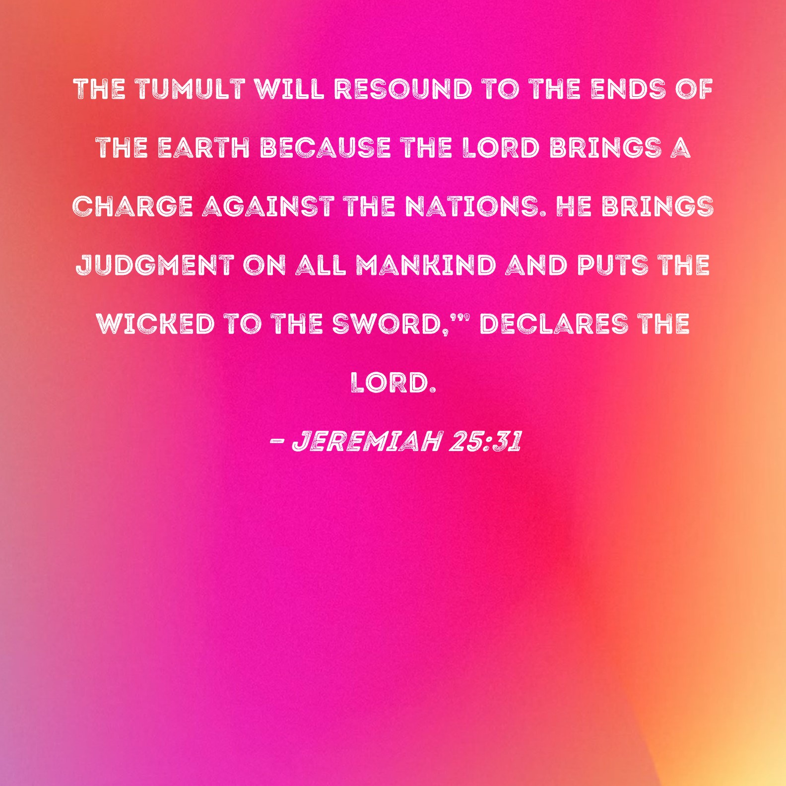 Jeremiah 25:31 The tumult will resound to the ends of the earth because the LORD brings a charge against the nations. He brings judgment on all mankind and puts the wicked to the sword,'" declares the LORD.