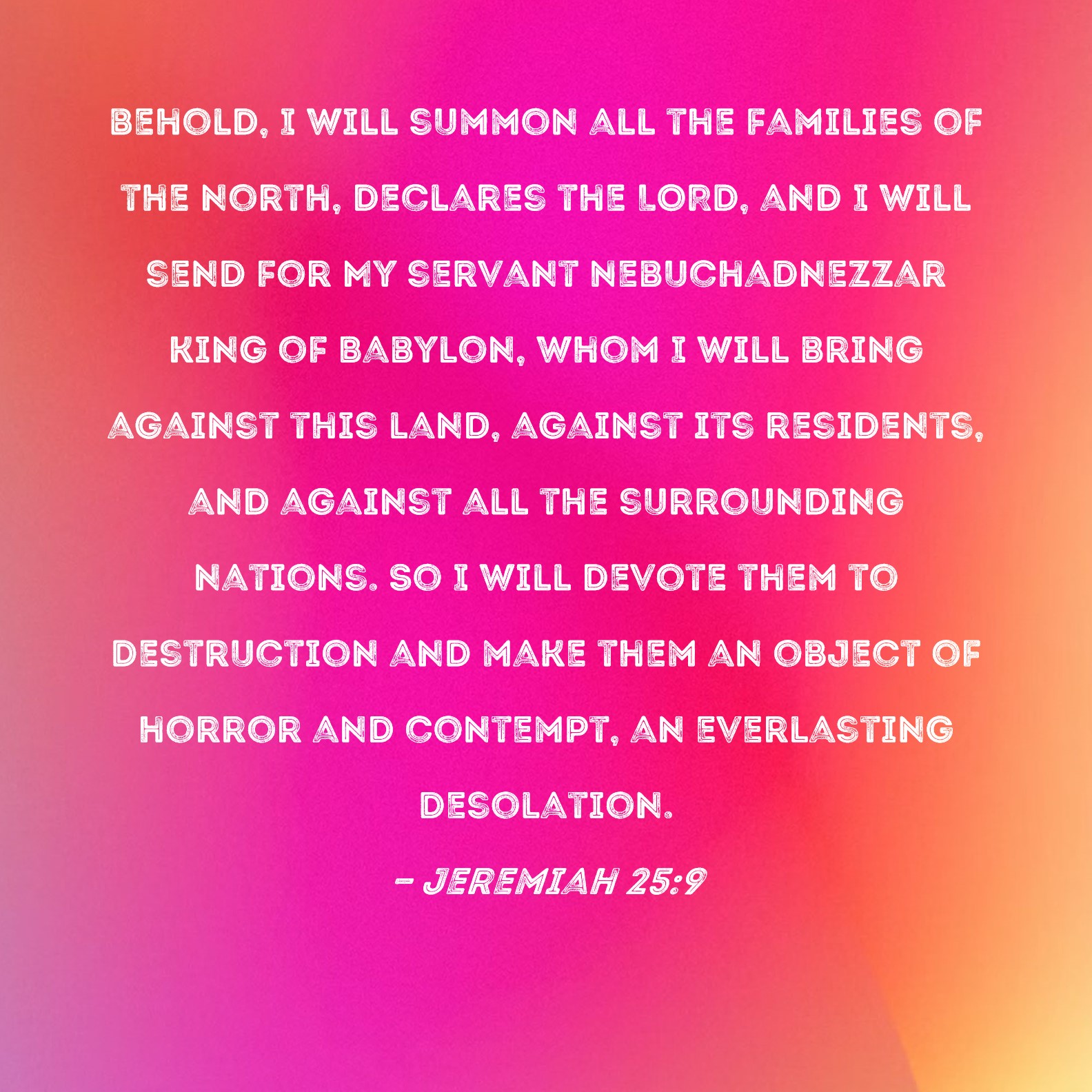Jeremiah 25:9 behold, I will summon all the families of the north, declares the LORD, and I will send for My servant Nebuchadnezzar king of Babylon, whom I will bring against this land, against its residents, and against all the surrounding nations. So I will devote them to destruction and make them an object of horror and contempt, an everlasting desolation.