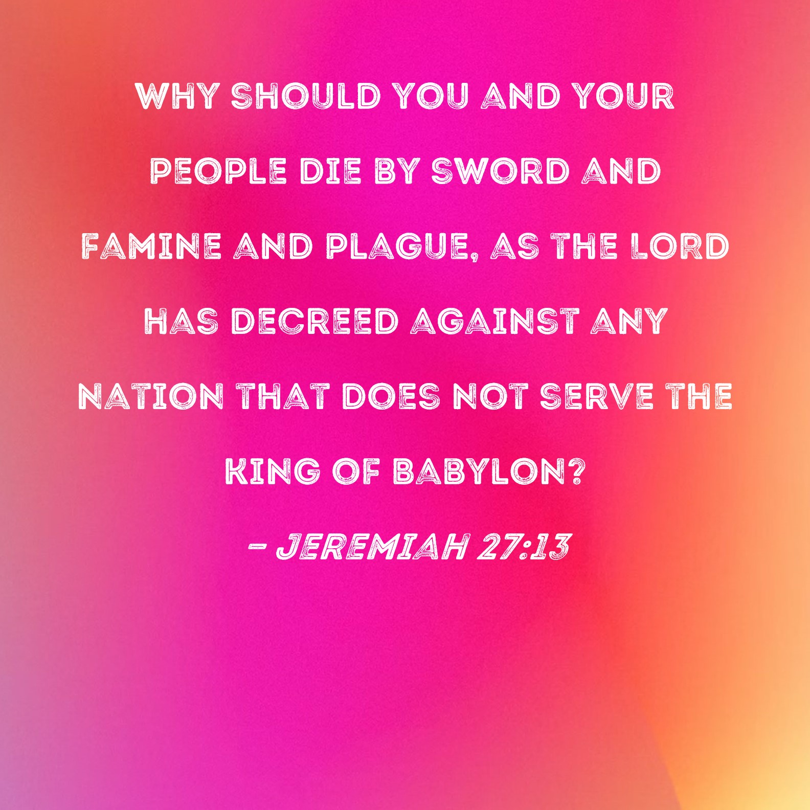 Jeremiah 27:13 Why should you and your people die by sword and famine and plague, as the LORD has decreed against any nation that does not serve the king of Babylon?