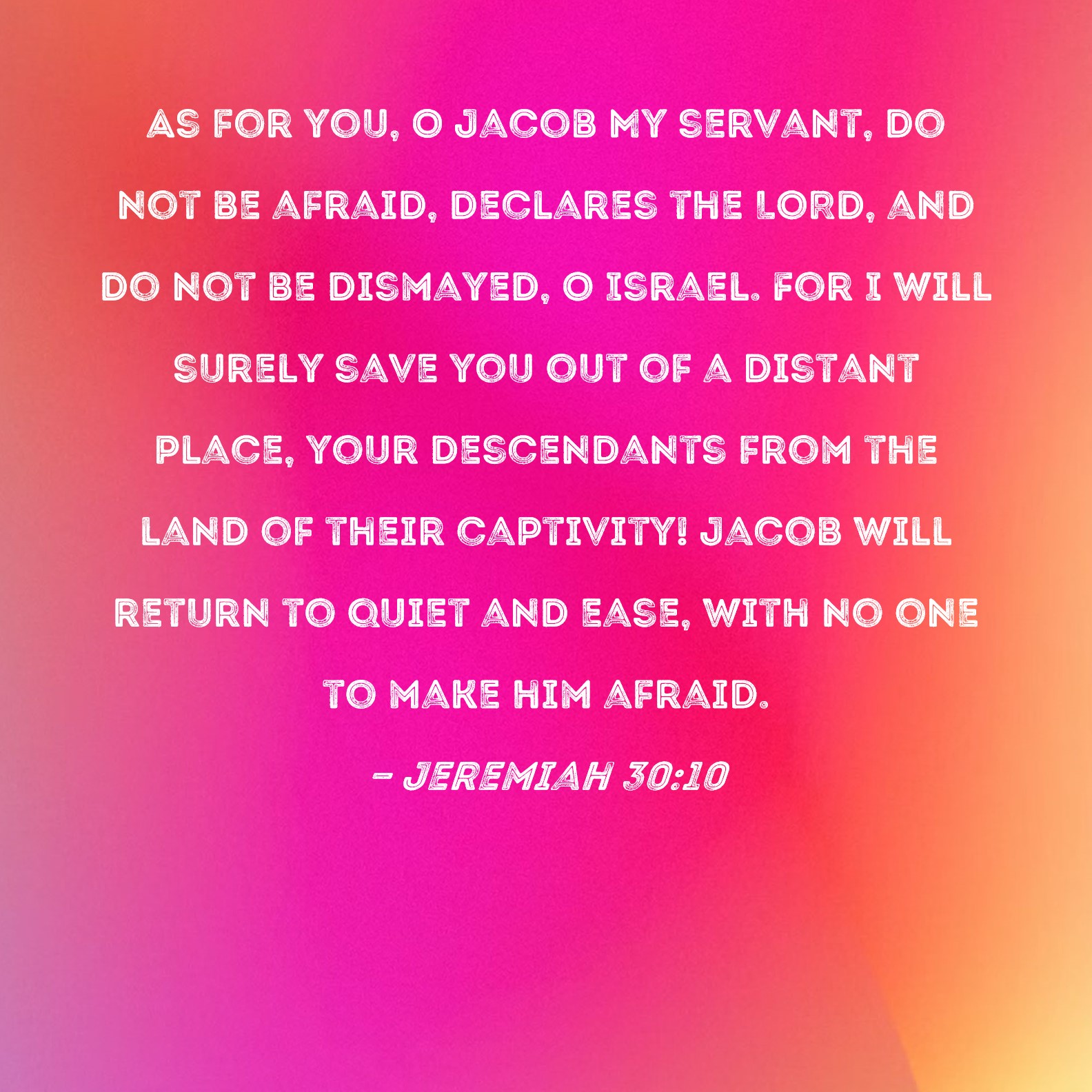 Jeremiah 30:10 As for you, O Jacob My servant, do not be afraid, declares the LORD, and do not be dismayed, O Israel. For I will surely save you out of a distant place, your descendants from the land of their captivity! Jacob will return to quiet and ease, with no one to make him afraid.