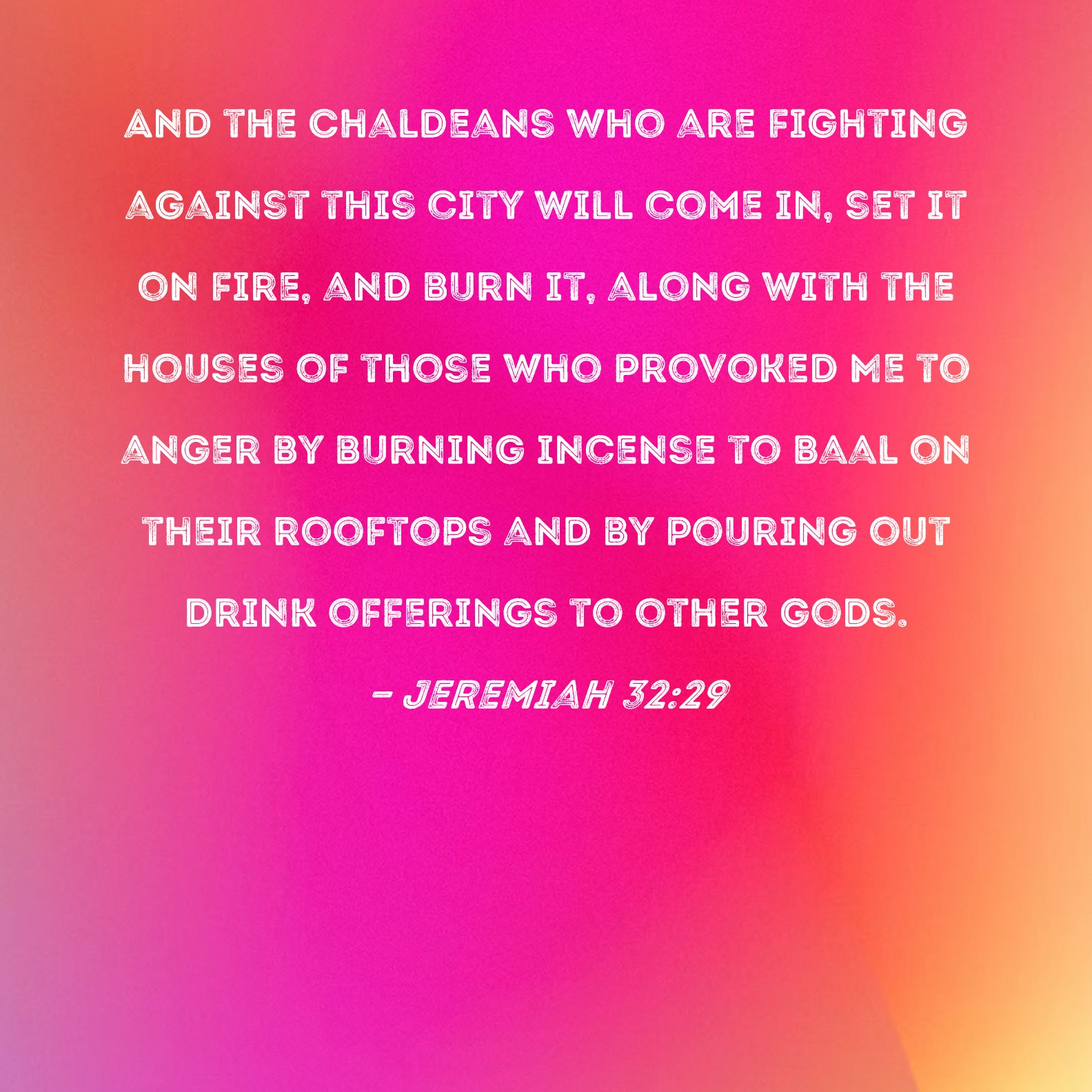 Jeremiah 32:29 And the Chaldeans who are fighting against this city will come in, set it on fire, and burn it, along with the houses of those who provoked Me to anger by burning incense to Baal on their rooftops and by pouring out drink offerings to other gods.