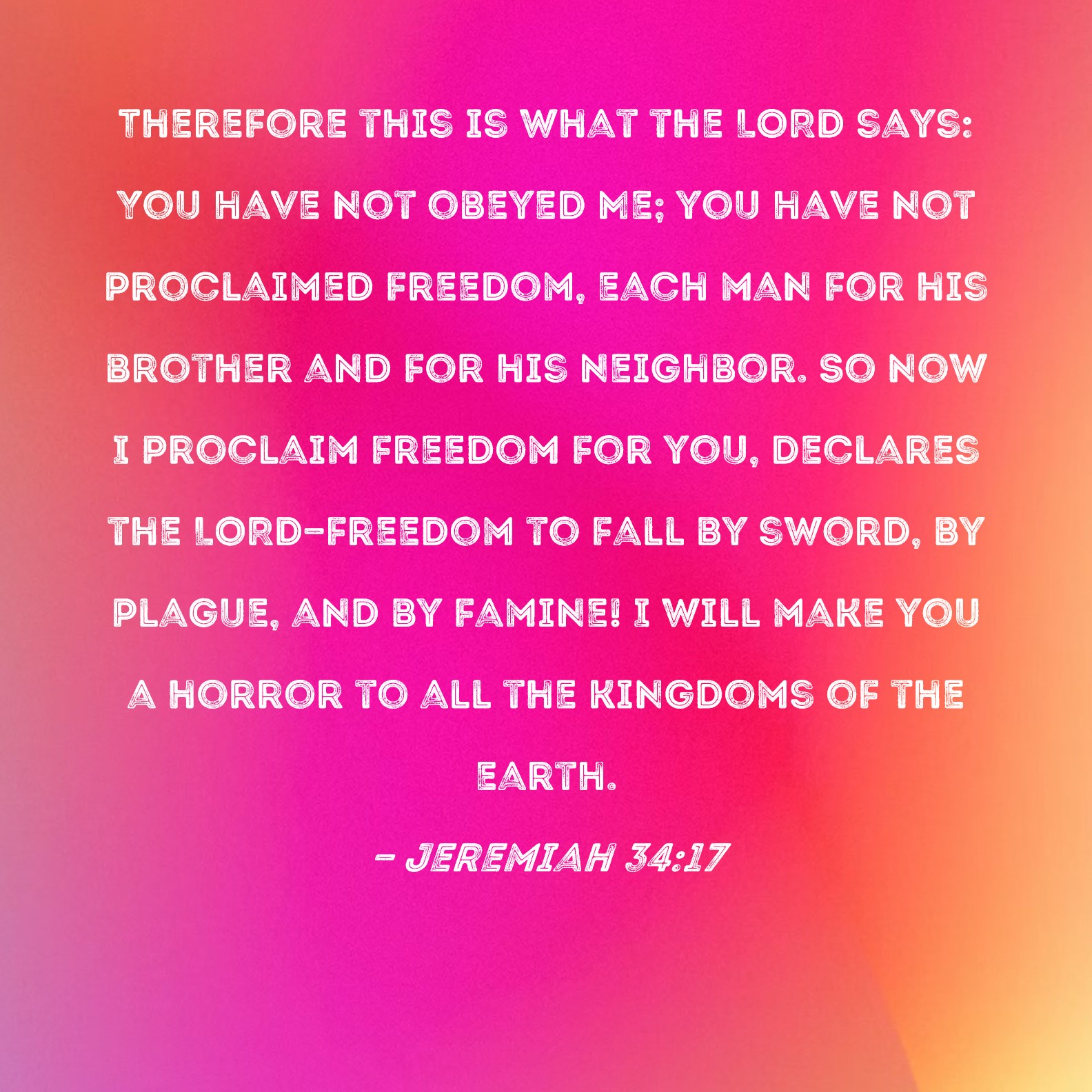 Jeremiah 34:17 Therefore this is what the LORD says: You have not obeyed Me; you have not proclaimed freedom, each man for his brother and for his neighbor. So now I proclaim freedom for you, declares the LORD--freedom to fall by sword, by plague, and by famine! I will make you a horror to all the kingdoms of the earth.