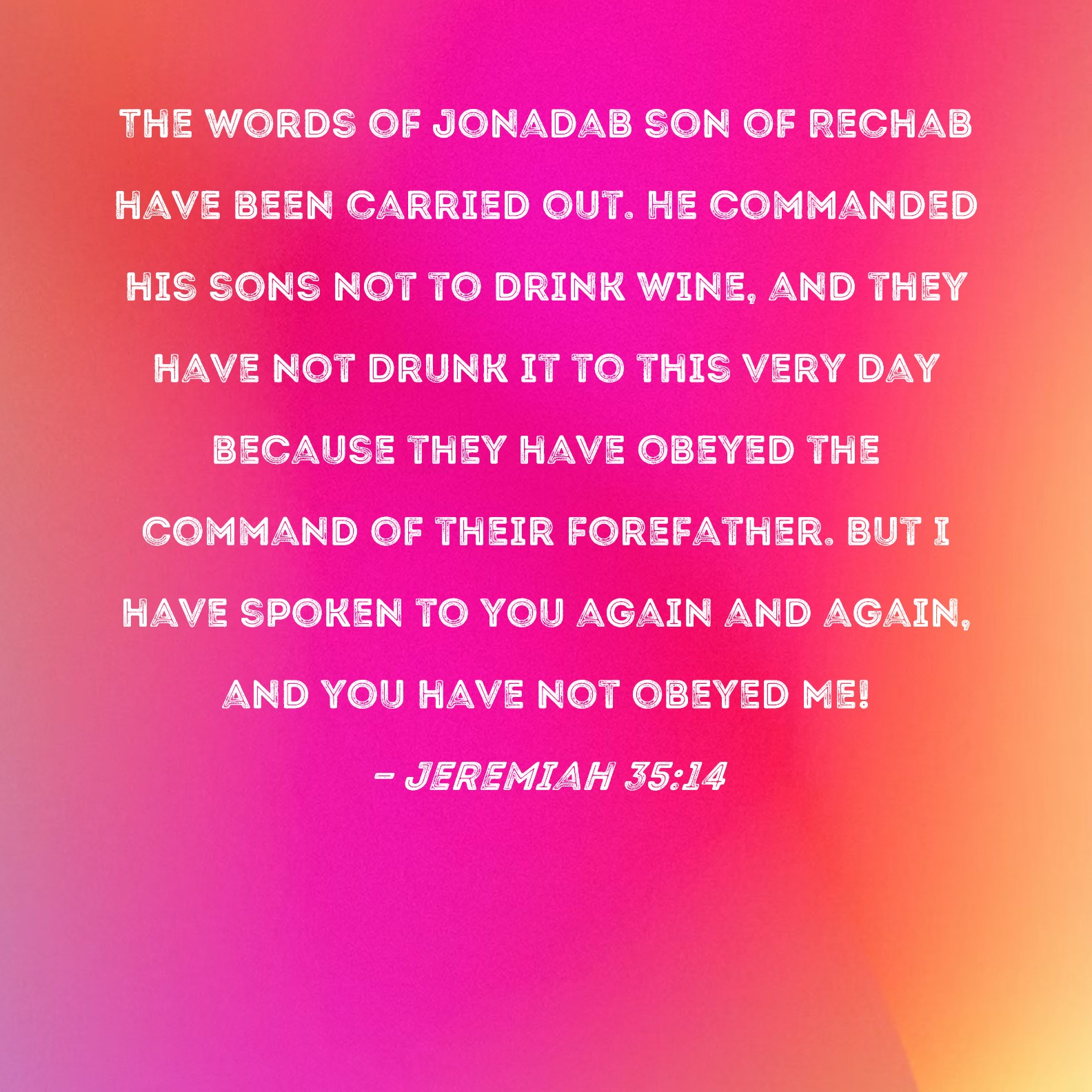 Jeremiah 35:14 The words of Jonadab son of Rechab have been carried out. He commanded his sons not to drink wine, and they have not drunk it to this very day because they have obeyed the command of their forefather. But I have spoken to you again and again, and you have not obeyed Me!