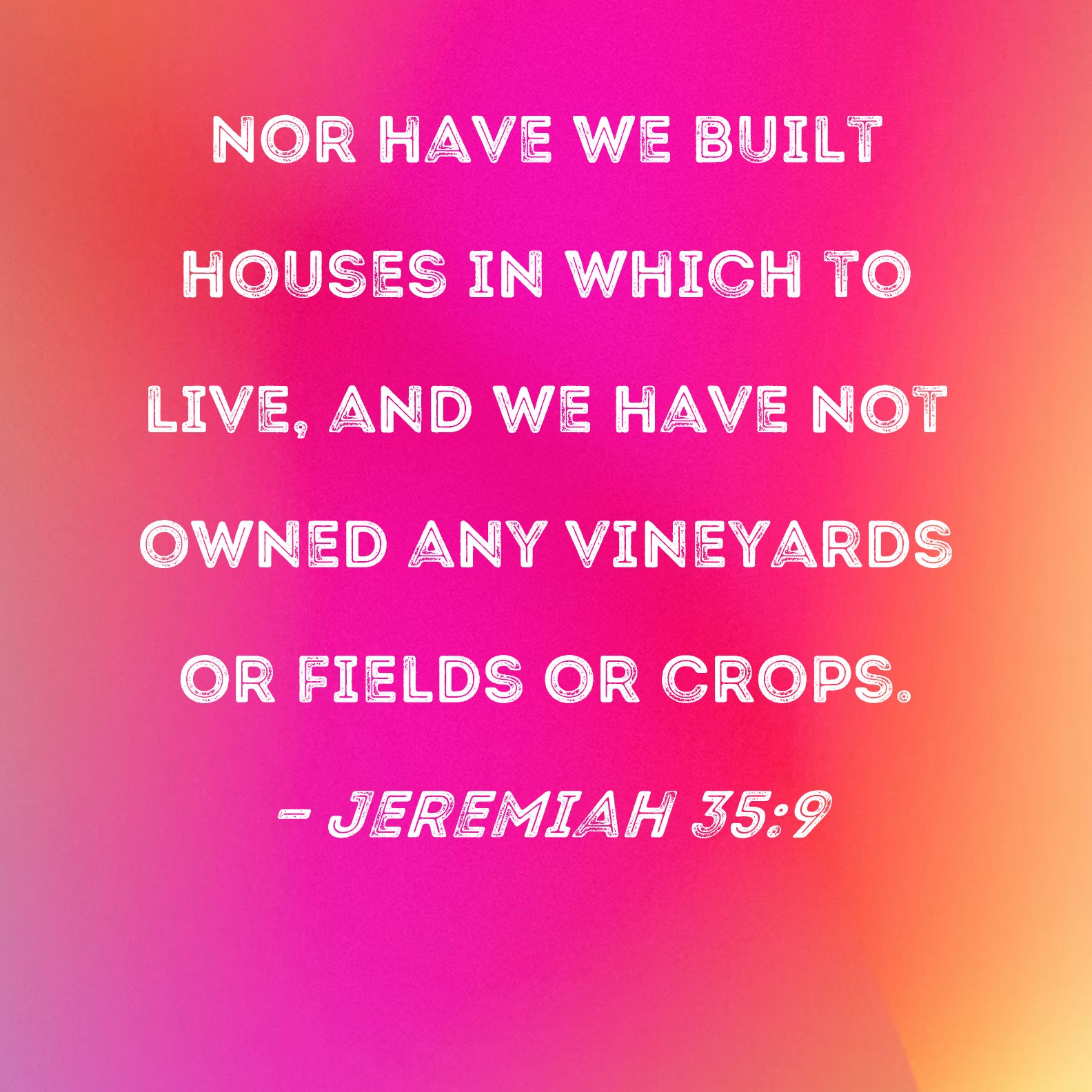 Jeremiah 35:9 Nor have we built houses in which to live, and we have not owned any vineyards or fields or crops.