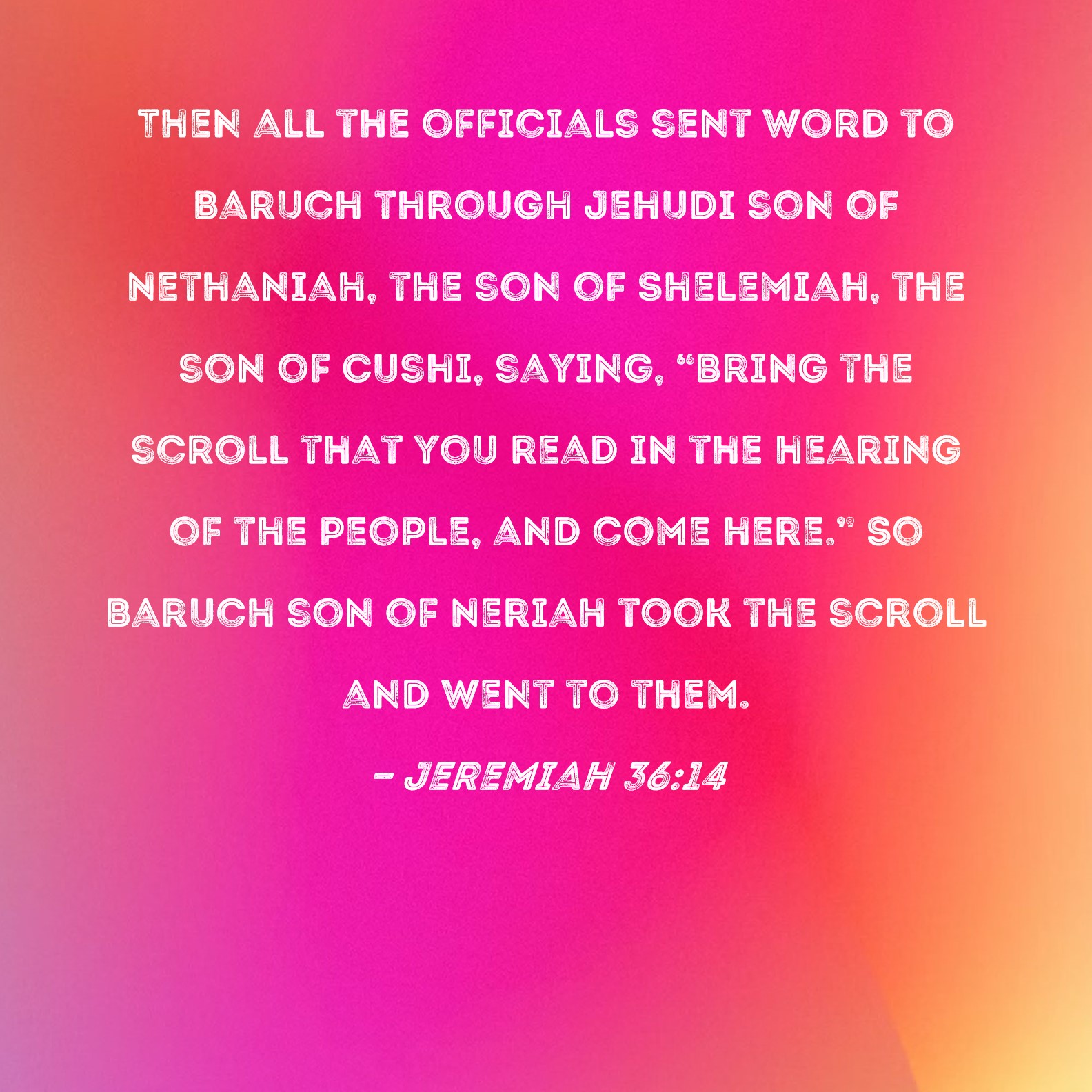 Jeremiah 36:14 Then all the officials sent word to Baruch through Jehudi son of Nethaniah, the son of Shelemiah, the son of Cushi, saying, "Bring the scroll that you read in the hearing of the people, and come here." So Baruch son of Neriah took the scroll and went to them.