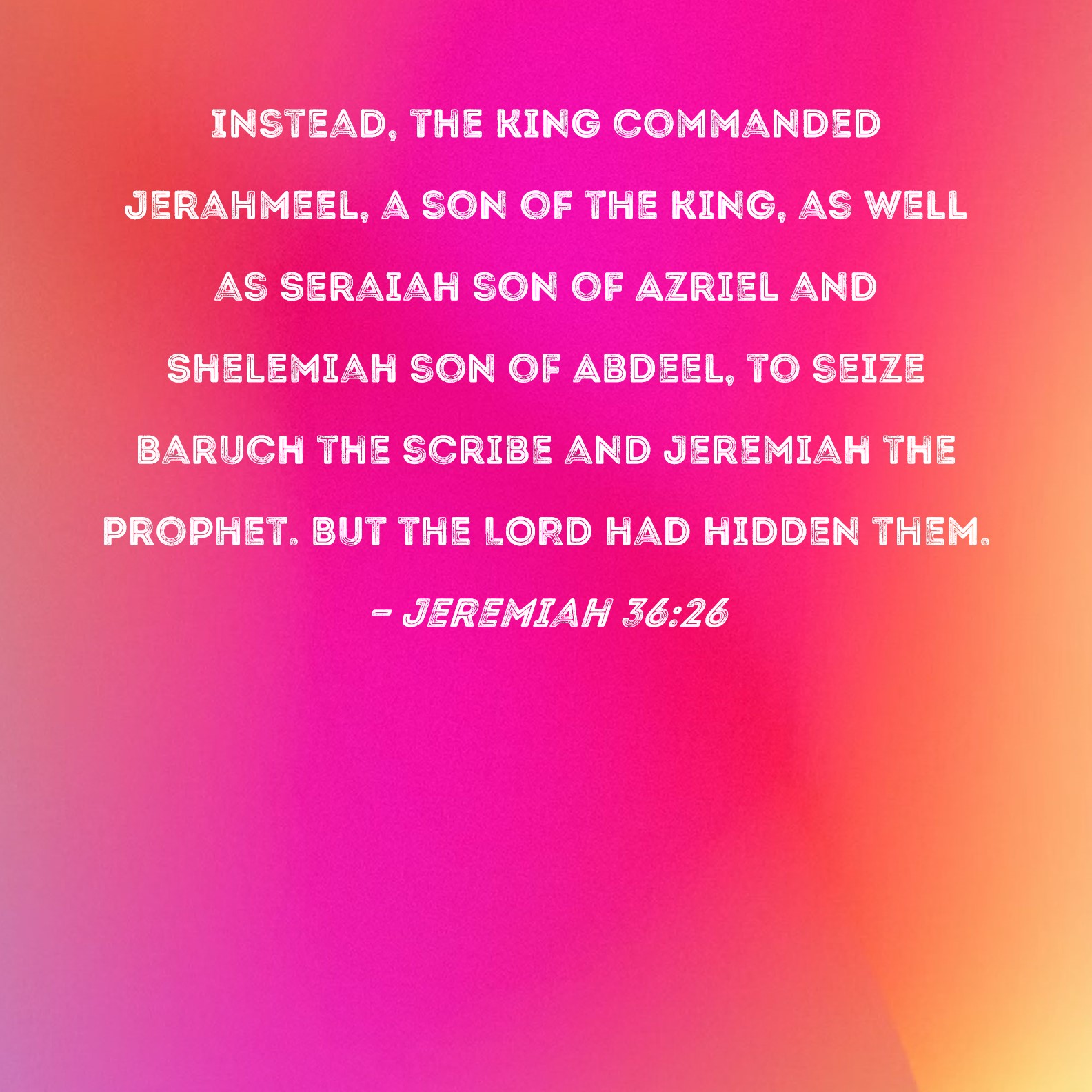 Jeremiah 36:26 Instead, the king commanded Jerahmeel, a son of the king, as well as Seraiah son of Azriel and Shelemiah son of Abdeel, to seize Baruch the scribe and Jeremiah the prophet. But the LORD had hidden them.