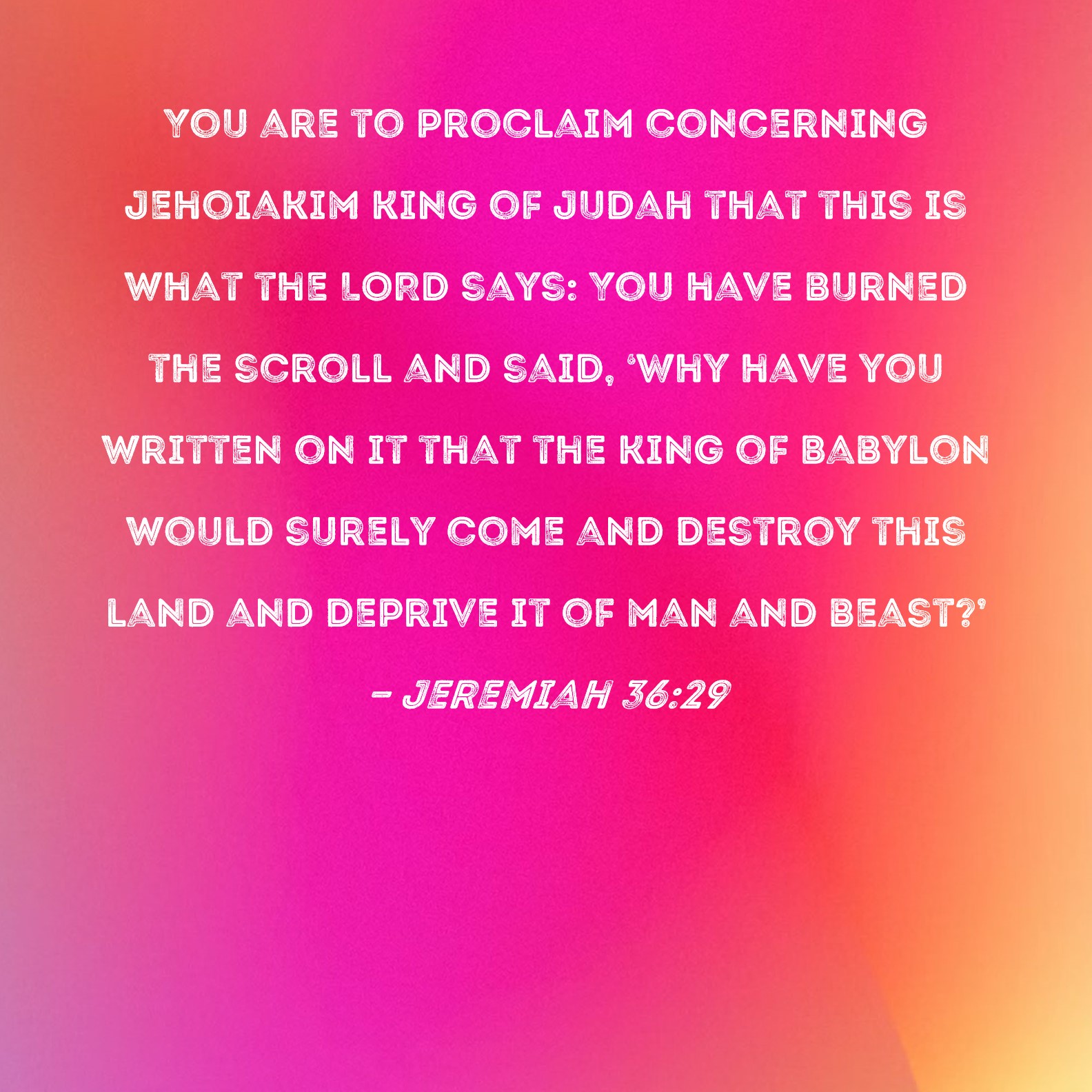 Jeremiah 36:29 You are to proclaim concerning Jehoiakim king of Judah that this is what the LORD says: You have burned the scroll and said, 'Why have you written on it that the king of Babylon would surely come and destroy this land and deprive it of man and beast?'