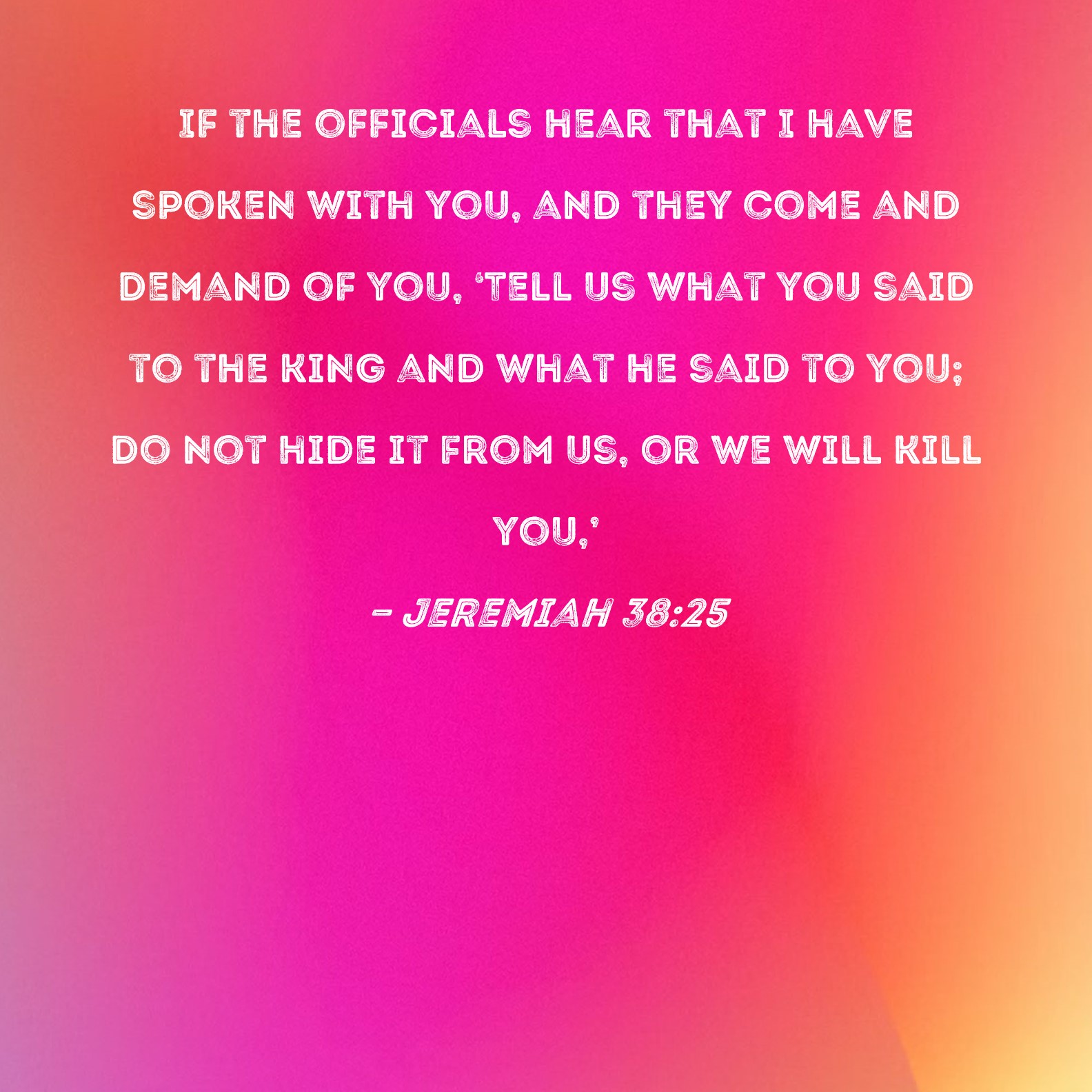 Jeremiah 38:25 If the officials hear that I have spoken with you, and they come and demand of you, 'Tell us what you said to the king and what he said to you; do not hide it from us, or we will kill you,'