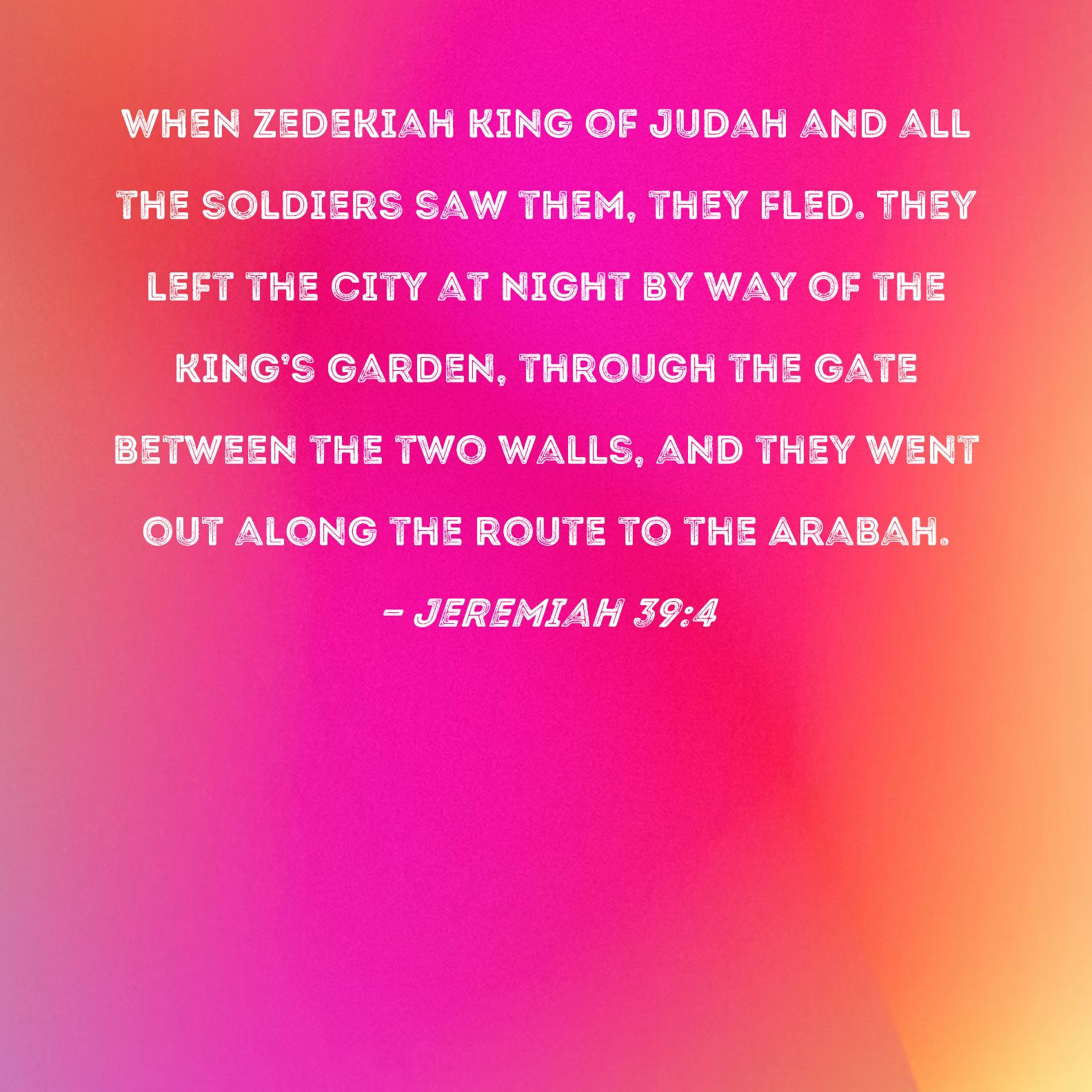 Jeremiah 39:4 When Zedekiah king of Judah and all the soldiers saw them, they fled. They left the city at night by way of the king's garden, through the gate between the two walls, and they went out along the route to the Arabah.