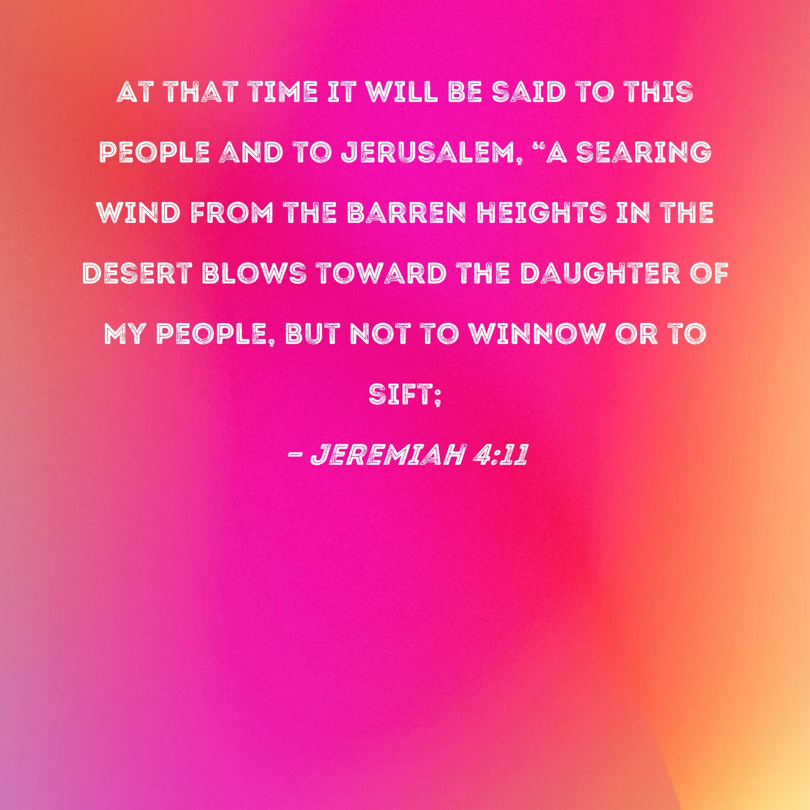 Jeremiah 4:11 At that time it will be said to this people and to Jerusalem, "A searing wind from the barren heights in the desert blows toward the daughter of My people, but not to winnow or to sift;
