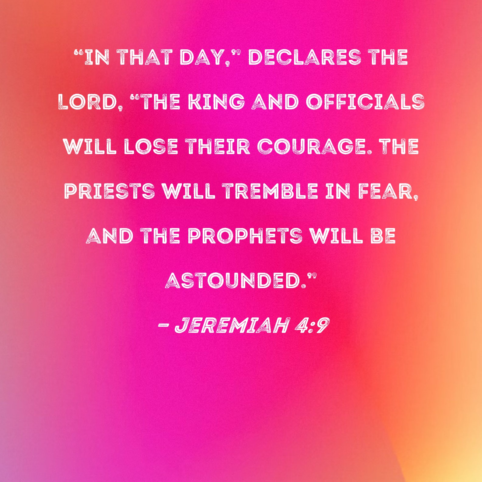 Jeremiah 4:9 "In that day," declares the LORD, "the king and officials will lose their courage. The priests will tremble in fear, and the prophets will be astounded."