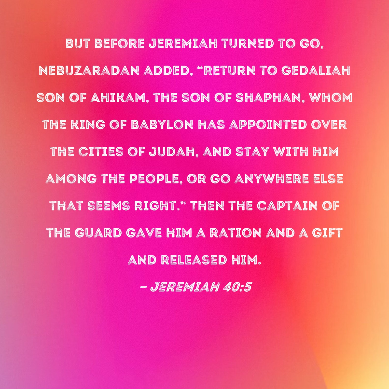 Jeremiah 40:5 But before Jeremiah turned to go, Nebuzaradan added, "Return to Gedaliah son of Ahikam, the son of Shaphan, whom the king of Babylon has appointed over the cities of Judah, and stay with him among the people, or go anywhere else that seems right." Then the captain of the guard gave him a ration and a gift and released him.