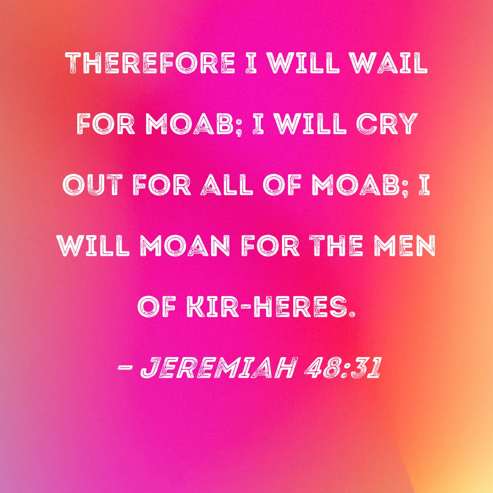 Jeremiah 48:31 Therefore I will wail for Moab; I will cry out for all of Moab; I will moan for the men of Kir-heres.