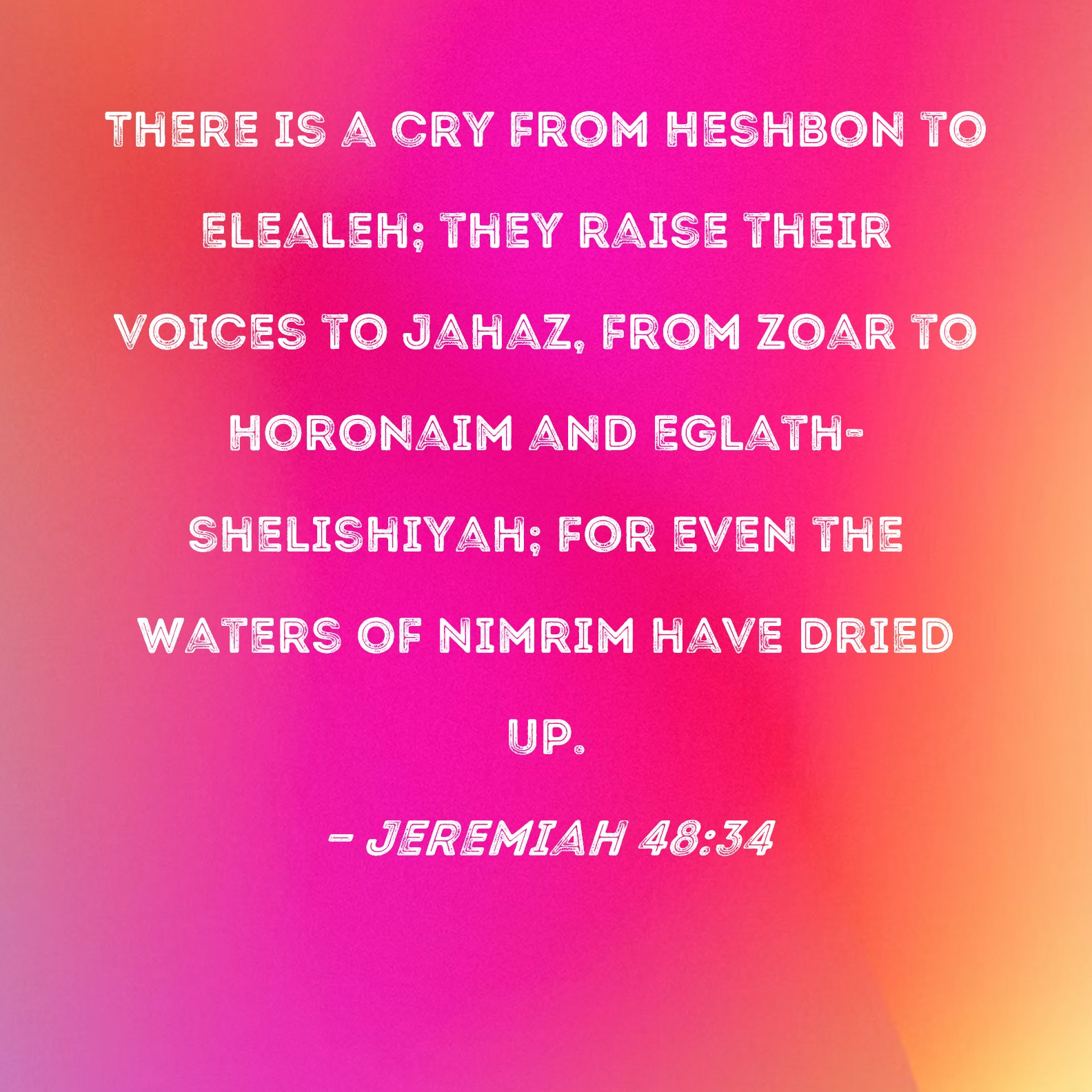 Jeremiah 48:34 There is a cry from Heshbon to Elealeh; they raise their voices to Jahaz, from Zoar to Horonaim and Eglath-shelishiyah; for even the waters of Nimrim have dried up.