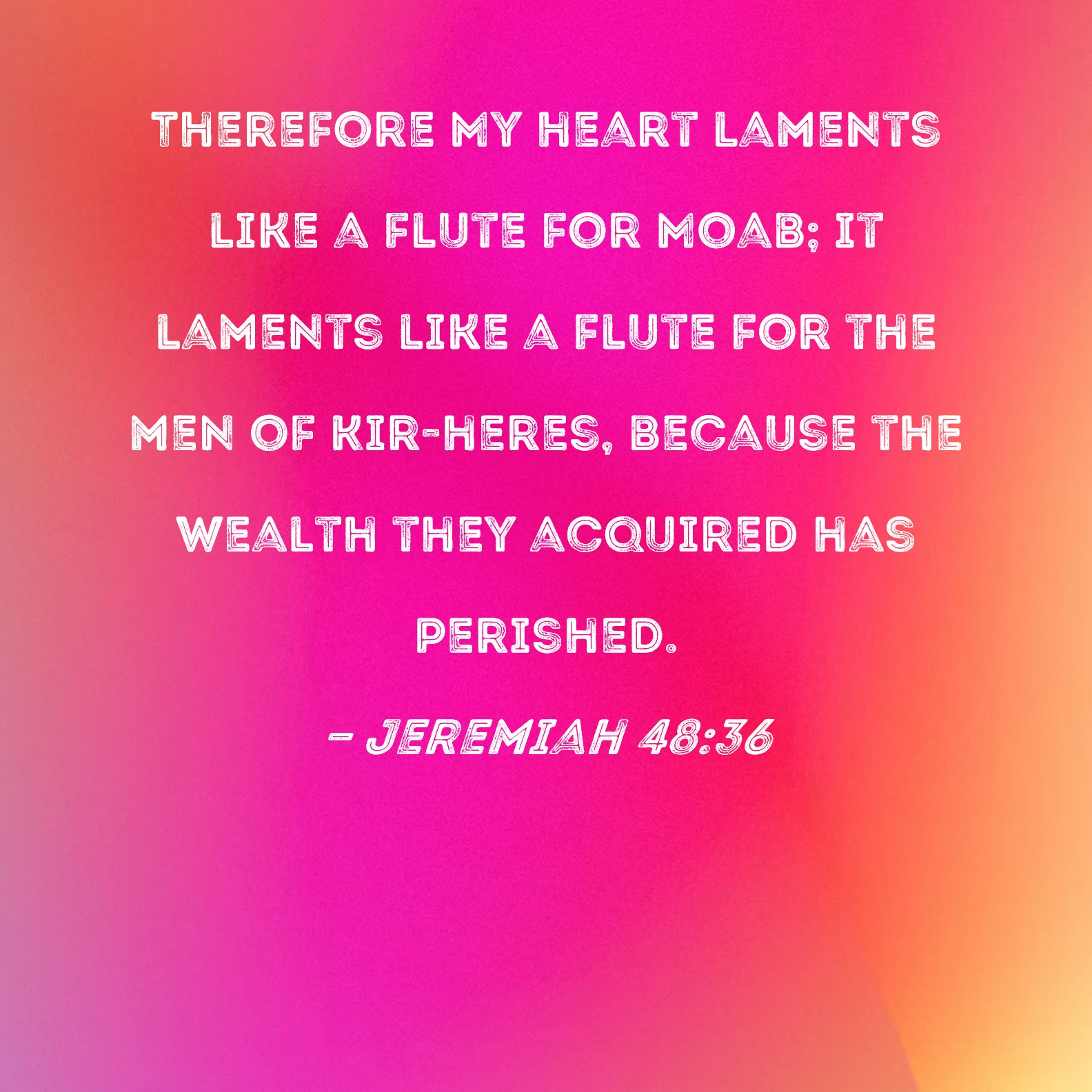 Jeremiah 48:36 Therefore My heart laments like a flute for Moab; it laments like a flute for the men of Kir-heres, because the wealth they acquired has perished.