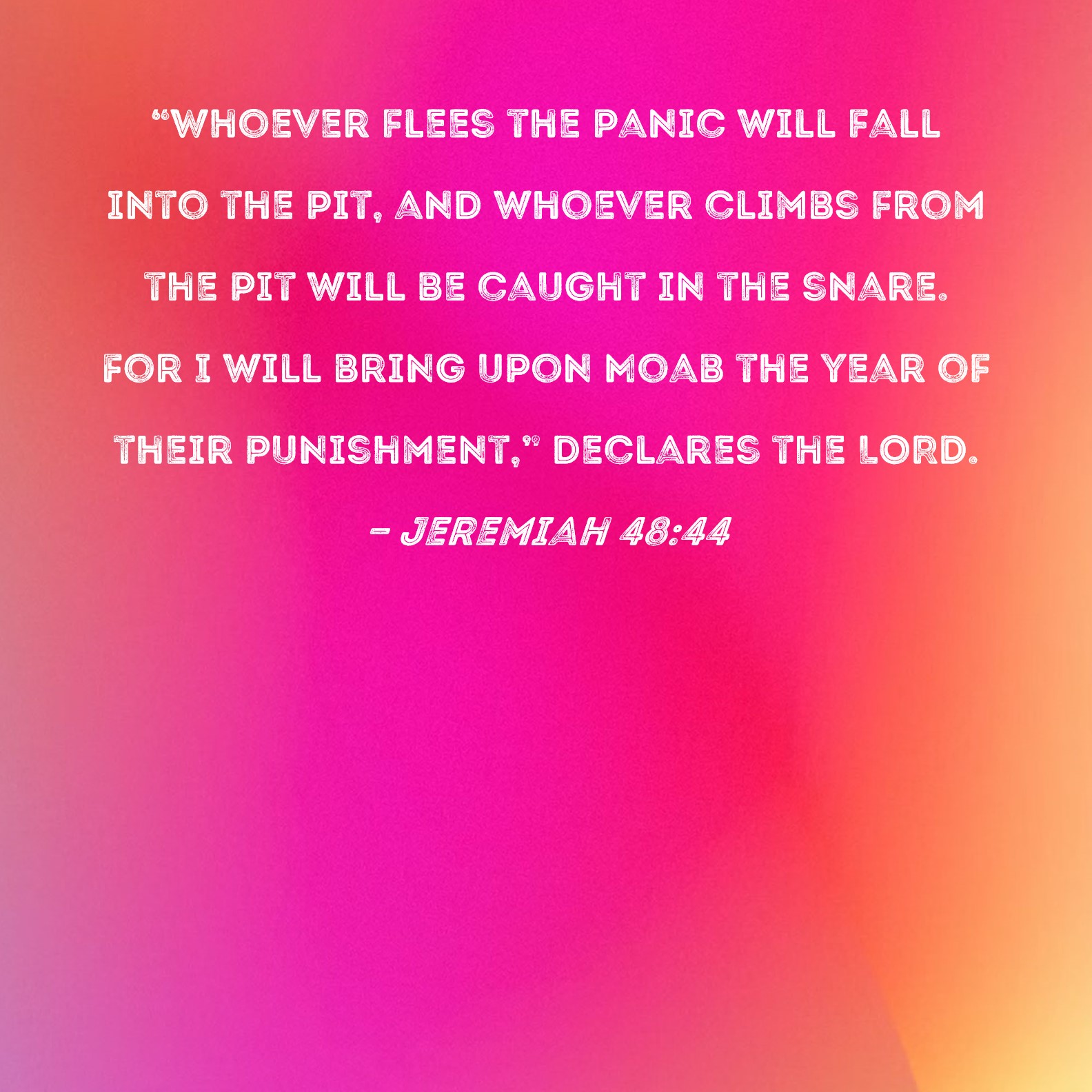 Jeremiah 48:44 "Whoever flees the panic will fall into the pit, and whoever climbs from the pit will be caught in the snare. For I will bring upon Moab the year of their punishment," declares the LORD.