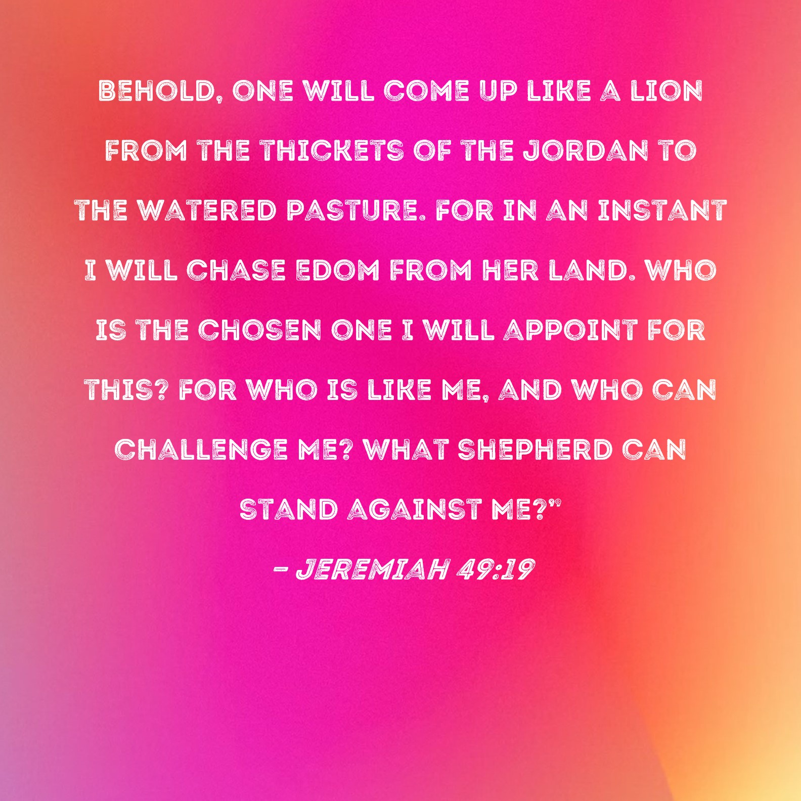 Jeremiah 49:19 Behold, one will come up like a lion from the thickets of the Jordan to the watered pasture. For in an instant I will chase Edom from her land. Who is the chosen one I will appoint for this? For who is like Me, and who can challenge Me? What shepherd can stand against Me?"