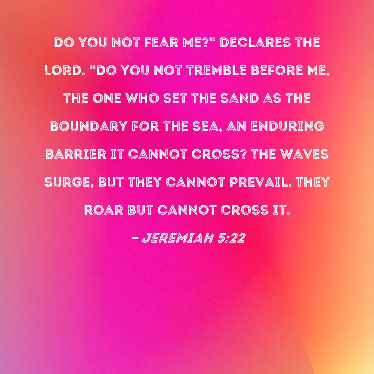 Jeremiah 5:22 Do you not fear Me?" declares the LORD. "Do you not tremble before Me, the One who set the sand as the boundary for the sea, an enduring barrier it cannot cross? The waves surge, but they cannot prevail. They roar but cannot cross it.