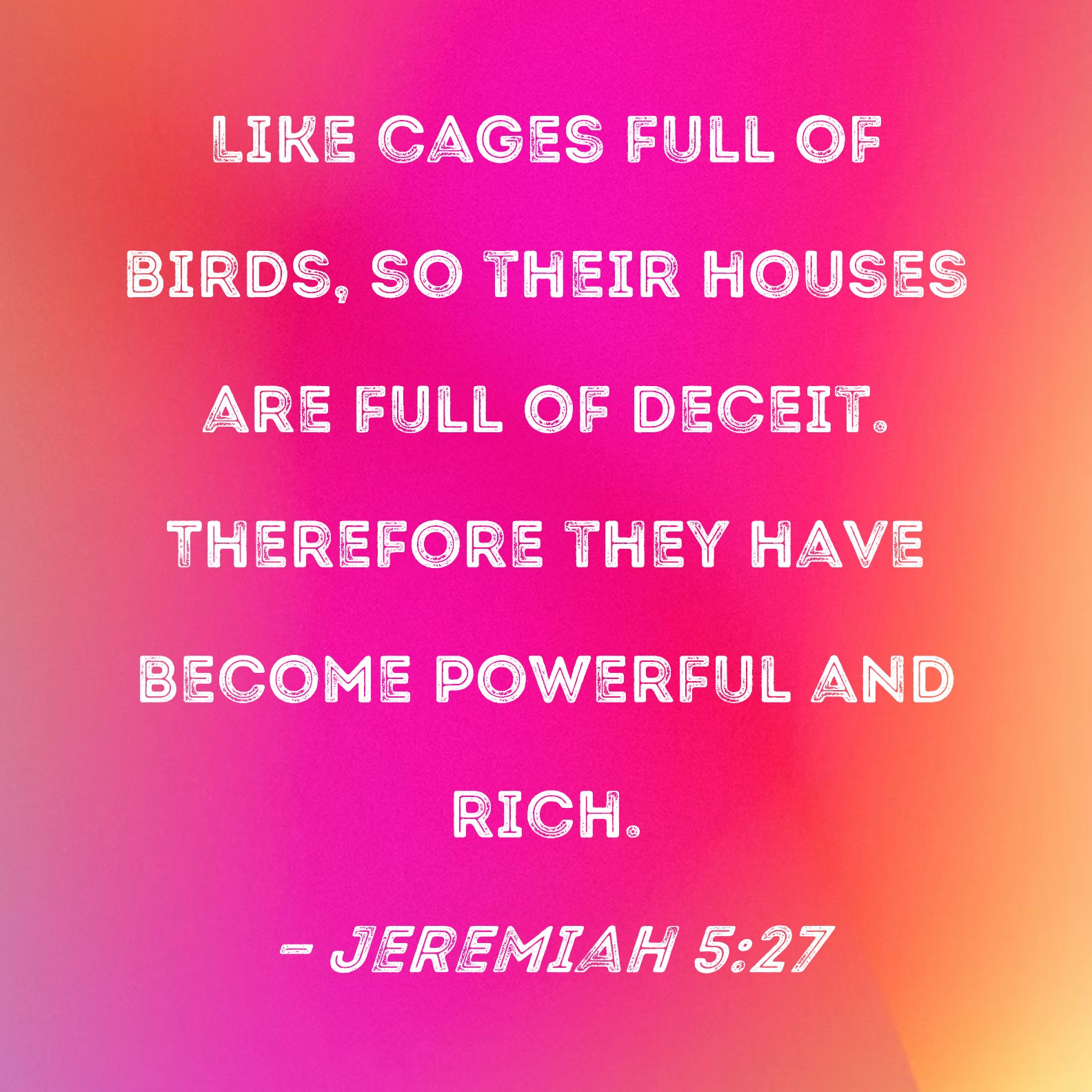 Jeremiah 5:27 Like cages full of birds, so their houses are full of deceit. Therefore they have become powerful and rich.