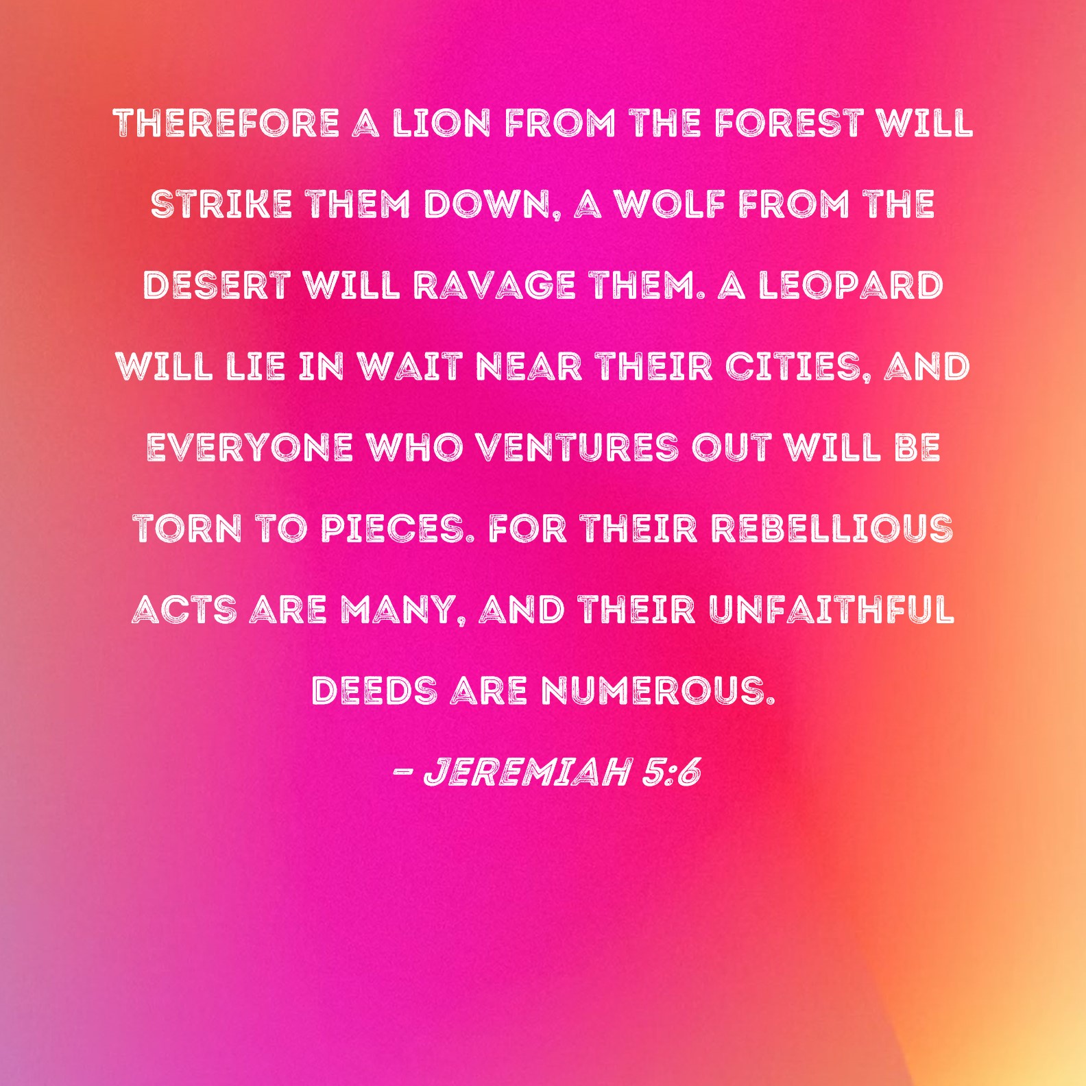 Jeremiah 5:6 Therefore a lion from the forest will strike them down, a wolf from the desert will ravage them. A leopard will lie in wait near their cities, and everyone who ventures out will be torn to pieces. For their rebellious acts are many, and their unfaithful deeds are numerous.