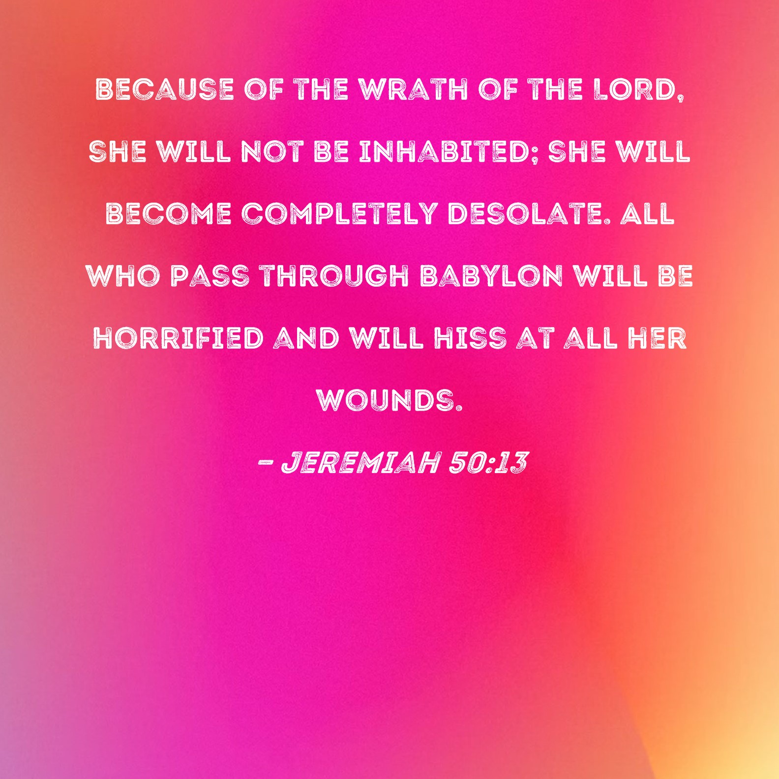 KJV:  Because of the wrath of the LORD it shall not be inhabited, but it shall be wholly desolate: every one that goeth by Babylon shall be astonished, and hiss at all her plagues.