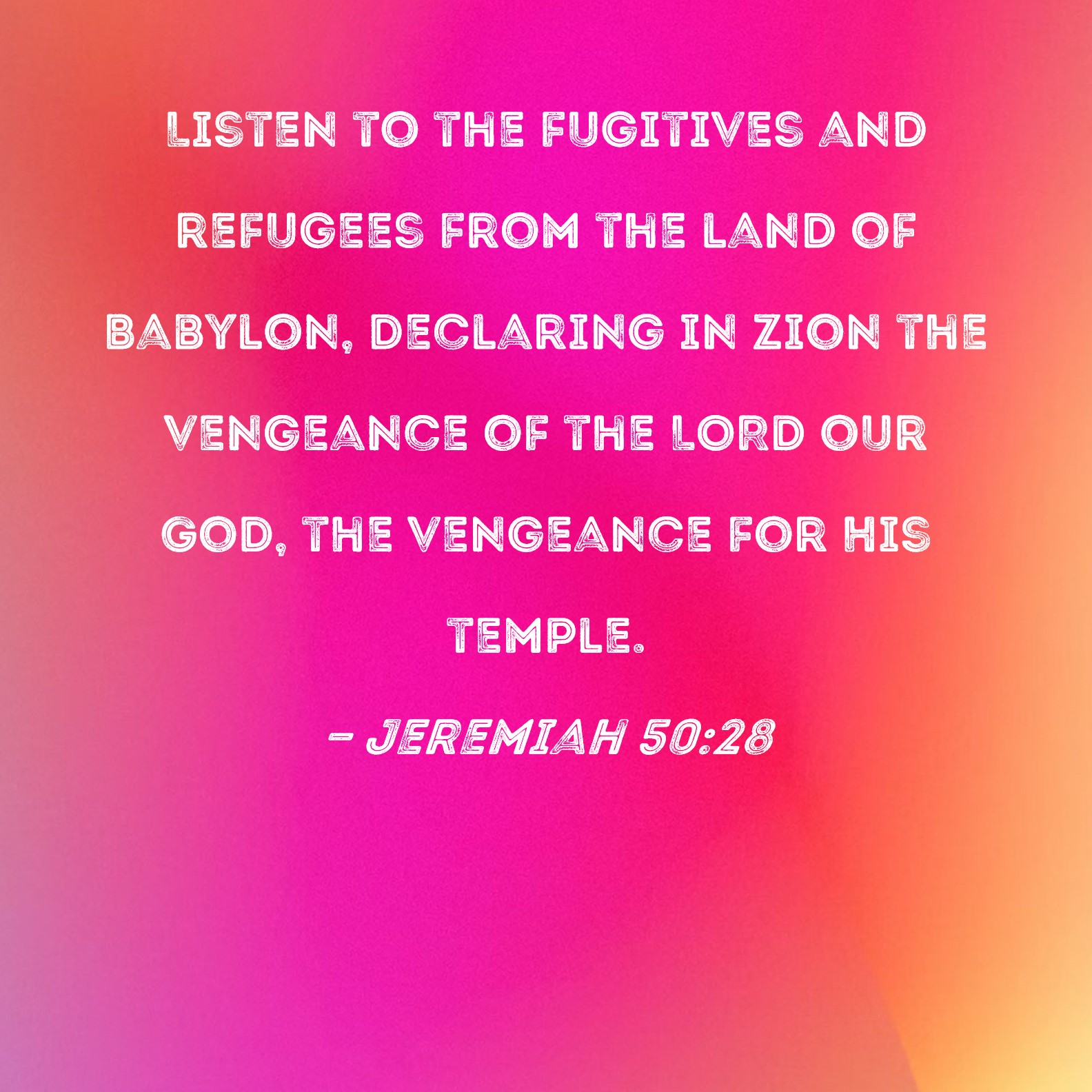 Jeremiah 50:28 Listen to the fugitives and refugees from the land of Babylon, declaring in Zion the vengeance of the LORD our God, the vengeance for His temple.