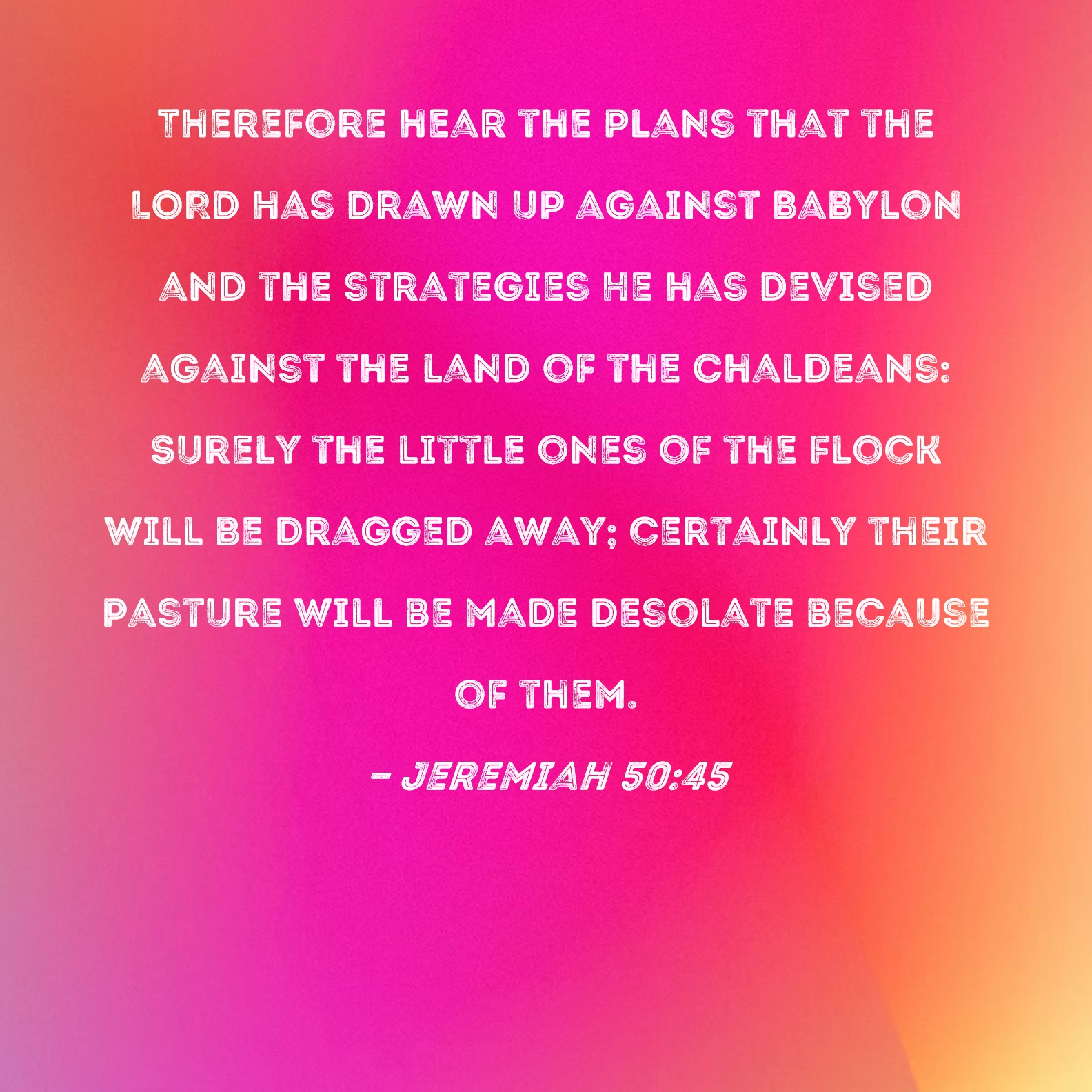 Jeremiah 50:45 Therefore hear the plans that the LORD has drawn up against Babylon and the strategies He has devised against the land of the Chaldeans: Surely the little ones of the flock will be dragged away; certainly their pasture will be made desolate because of them.