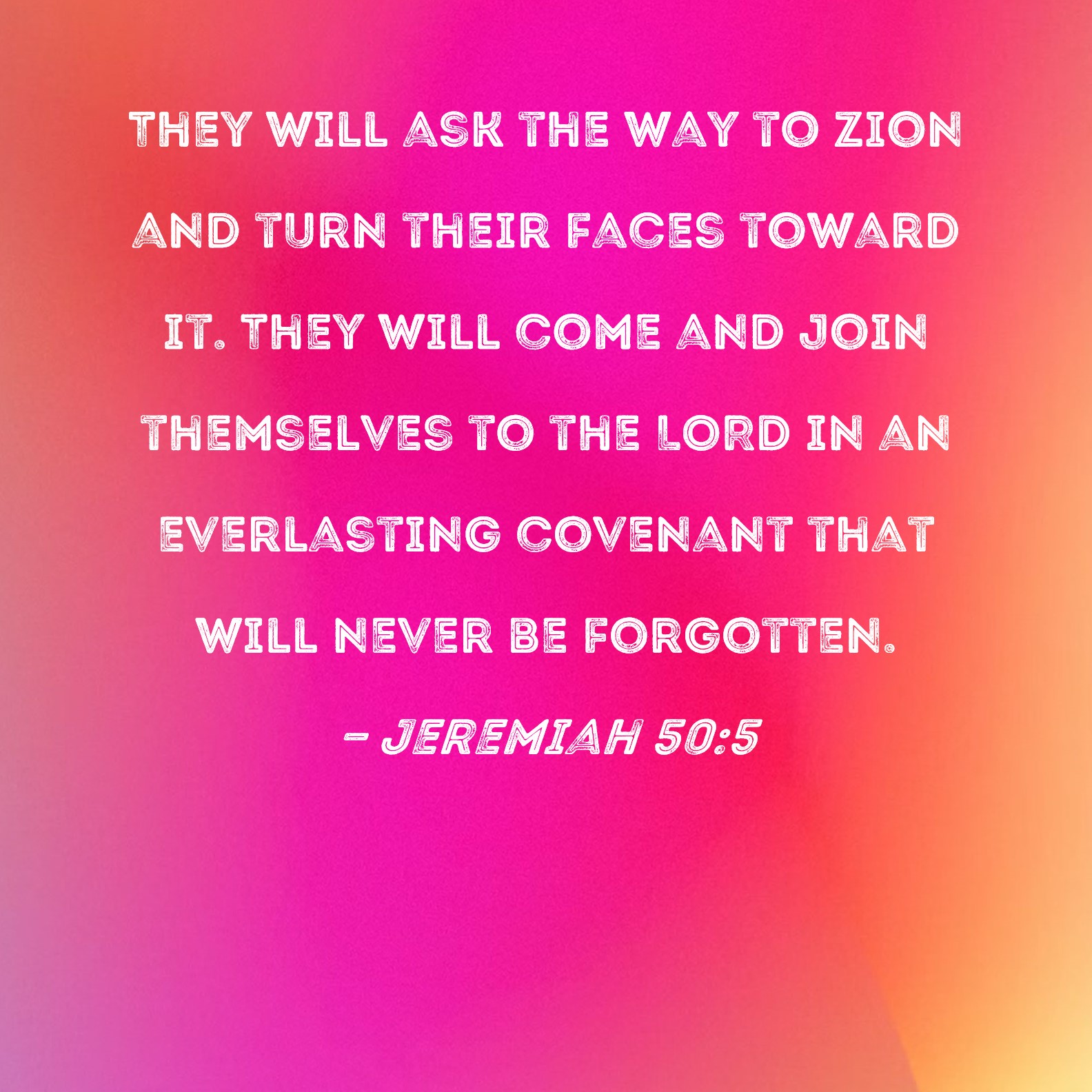 Jeremiah 50:5 They will ask the way to Zion and turn their faces toward it. They will come and join themselves to the LORD in an everlasting covenant that will never be forgotten.