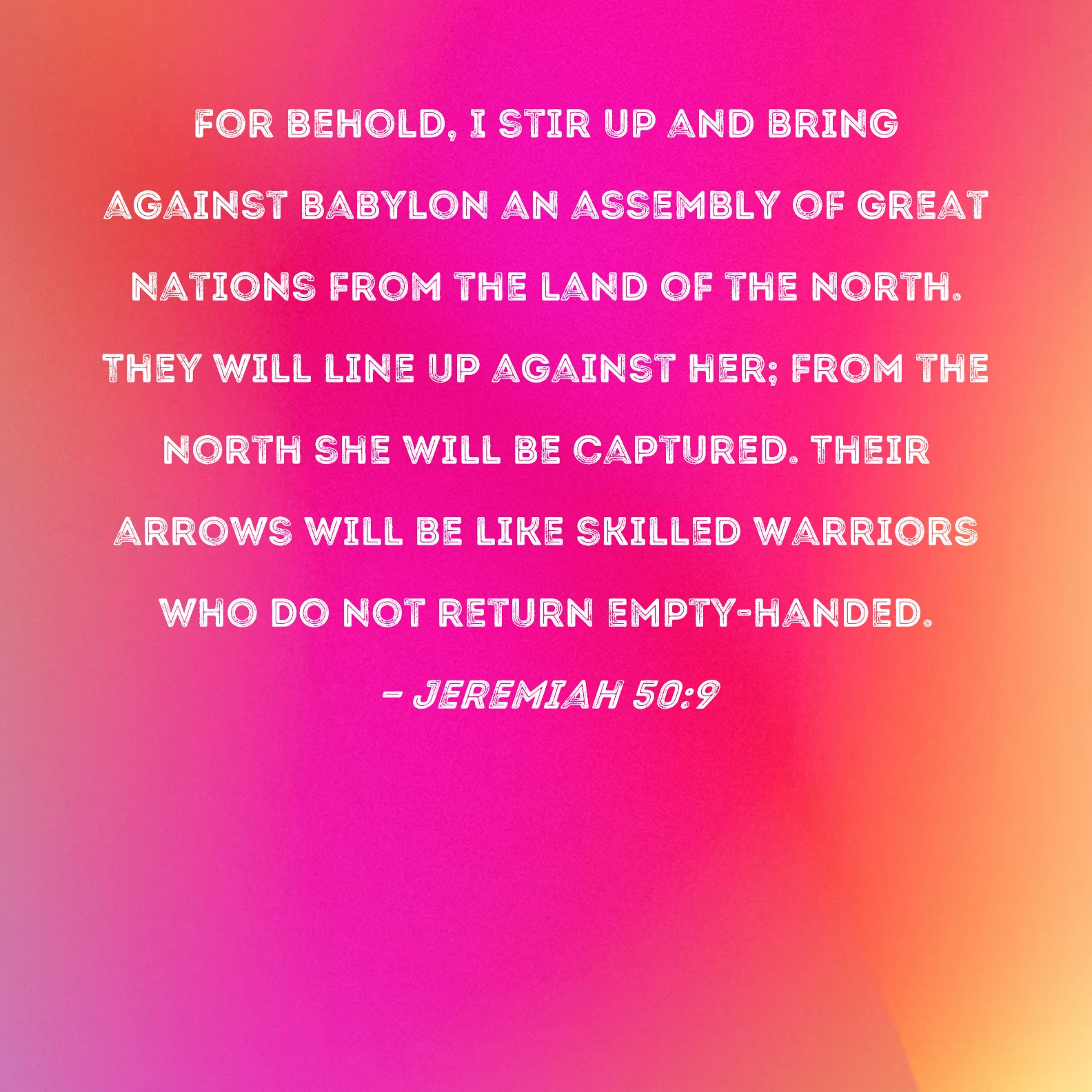 For behold, I stir up and bring against Babylon an assembly of great nations from the land of the north. They will line up against her; from the north she will be captured. Their arrows will be like skilled warriors who do not return empty-handed.