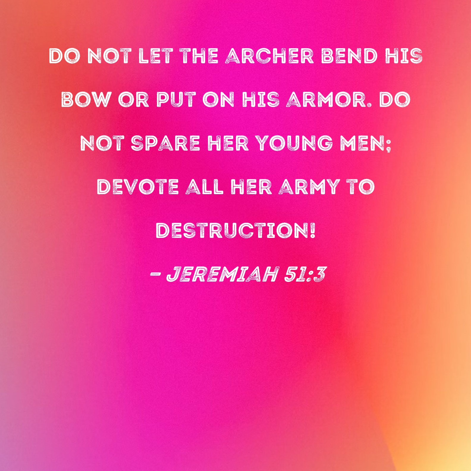 Jeremiah 51:3 Do not let the archer bend his bow or put on his armor. Do not spare her young men; devote all her army to destruction!