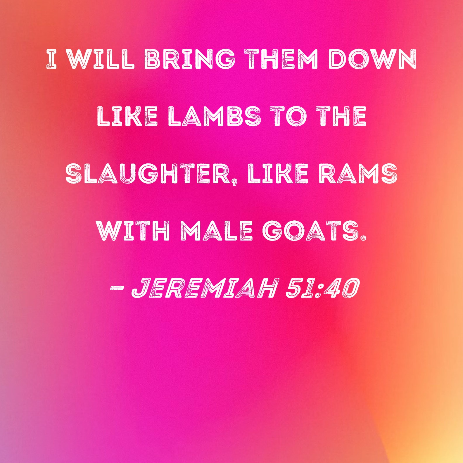 Jeremiah 51:40 I will bring them down like lambs to the slaughter, like rams with male goats.