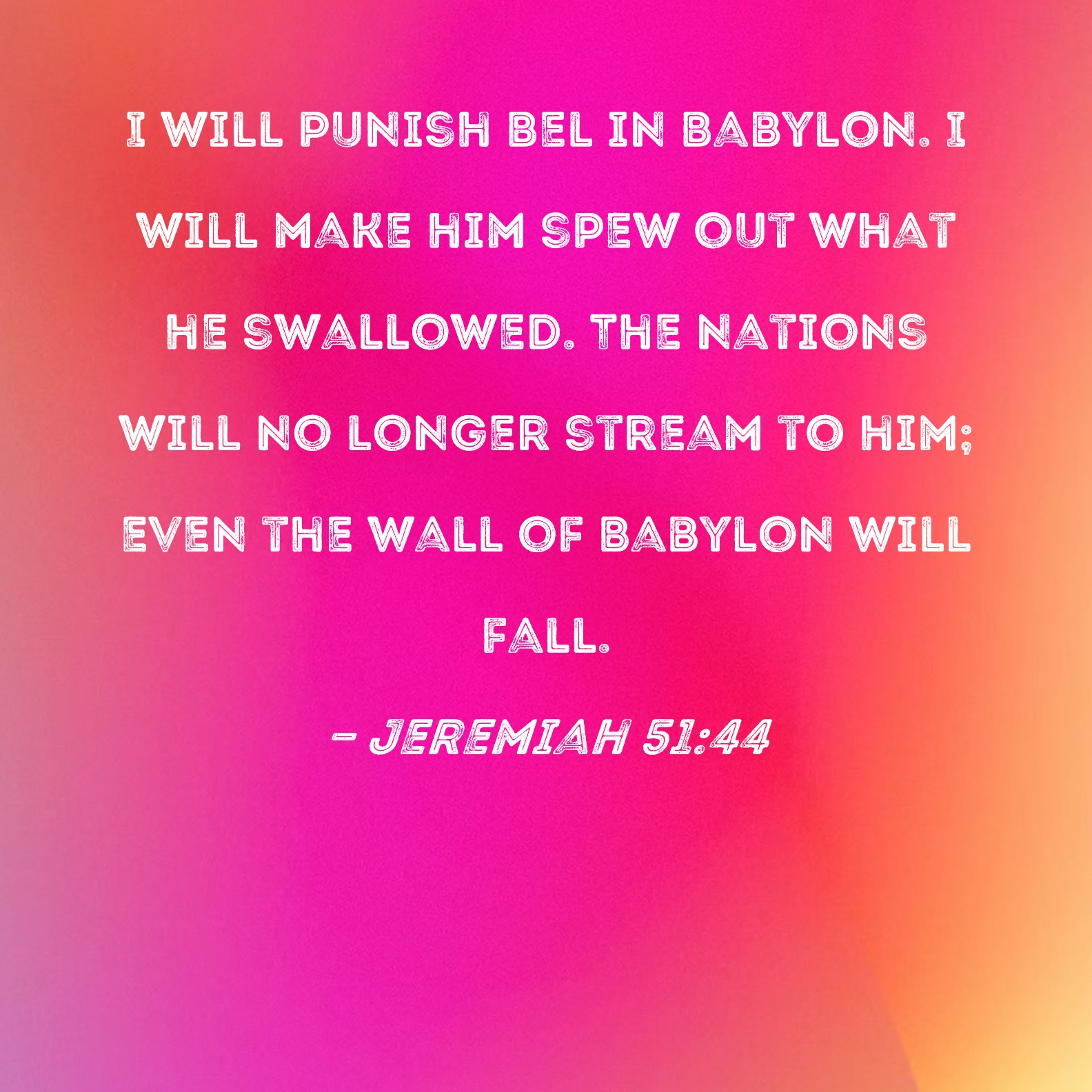 Jeremiah 51:44 I will punish Bel in Babylon. I will make him spew out what he swallowed. The nations will no longer stream to him; even the wall of Babylon will fall.