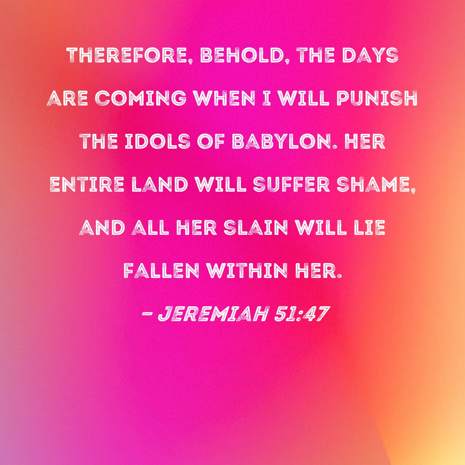 Jeremiah 51:47 Therefore, behold, the days are coming when I will punish the idols of Babylon. Her entire land will suffer shame, and all her slain will lie fallen within her.