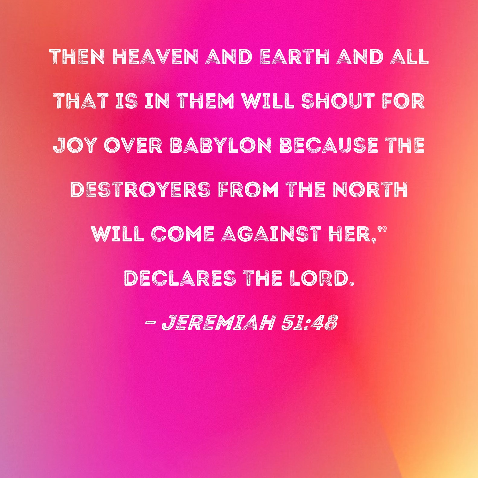 Jeremiah 51:48 Then heaven and earth and all that is in them will shout for joy over Babylon because the destroyers from the north will come against her," declares the LORD.