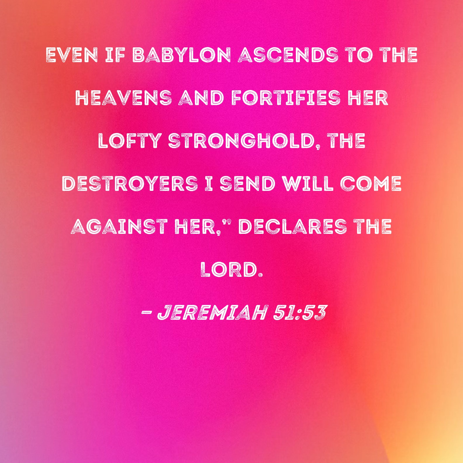 Jeremiah 51:53 Even if Babylon ascends to the heavens and fortifies her lofty stronghold, the destroyers I send will come against her," declares the LORD.