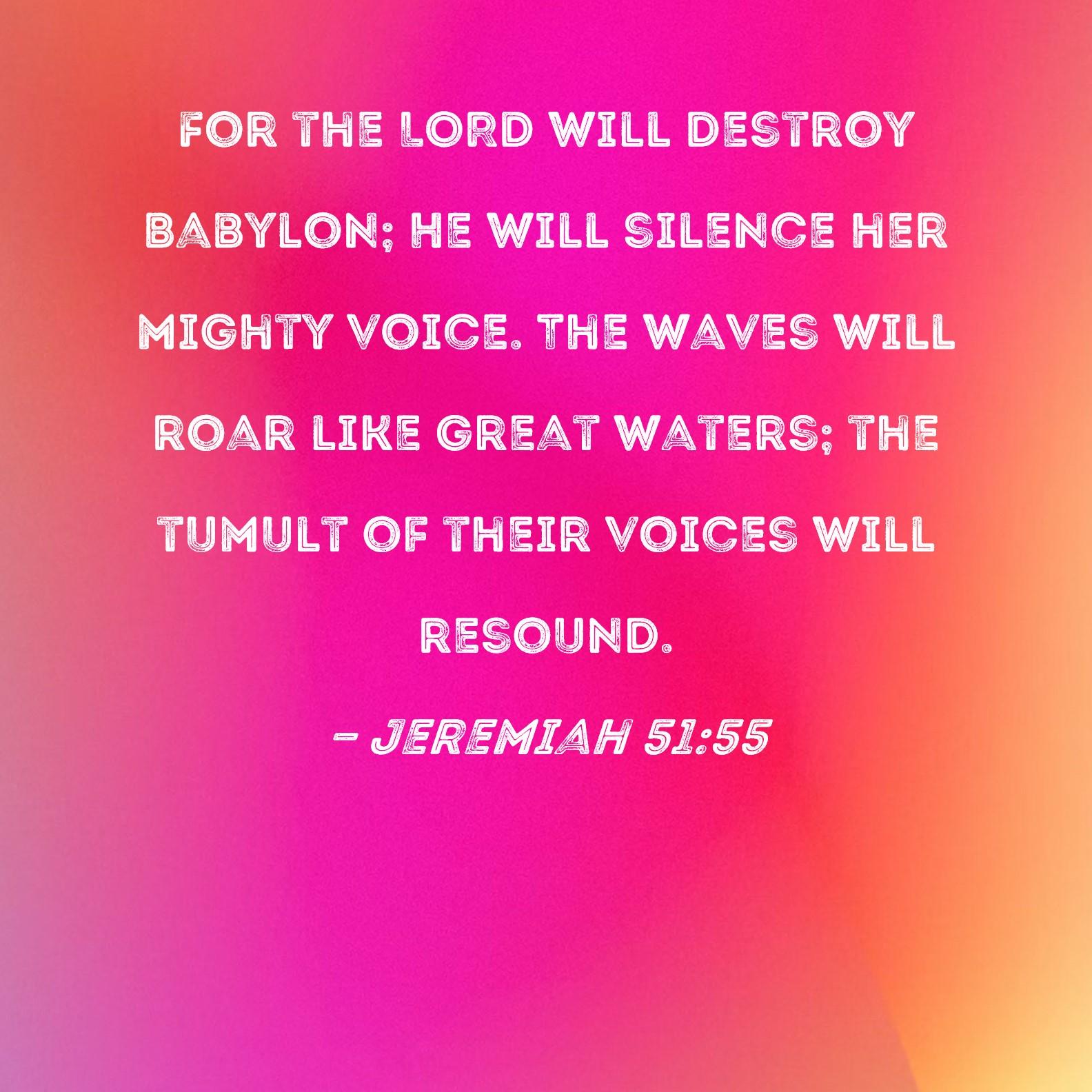 Jeremiah 51:55 For the LORD will destroy Babylon; He will silence her mighty voice. The waves will roar like great waters; the tumult of their voices will resound.