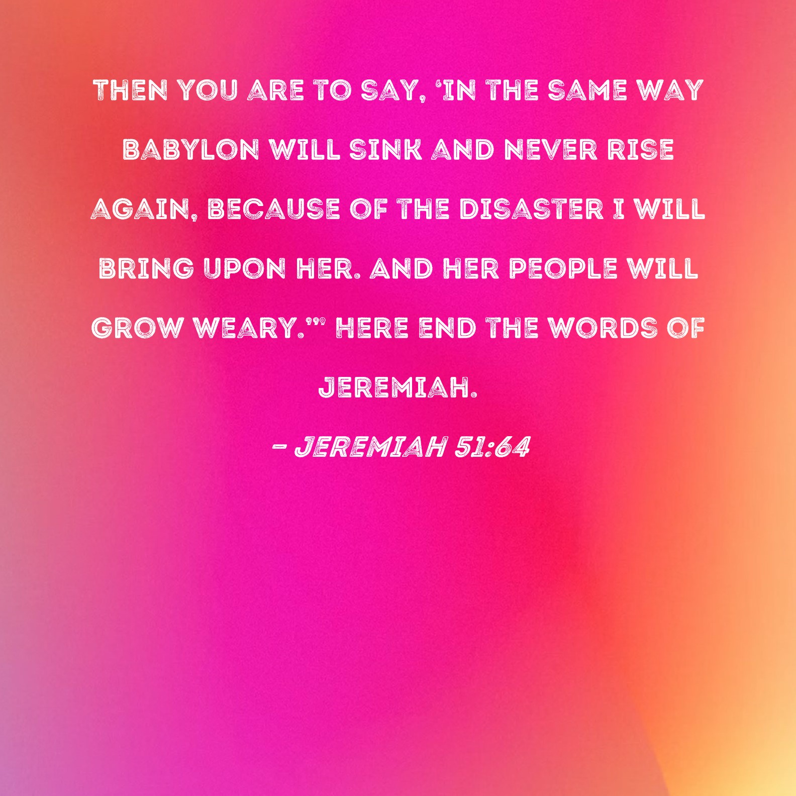 Jeremiah 51:64 Then you are to say, 'In the same way Babylon will sink and never rise again, because of the disaster I will bring upon her. And her people will grow weary.'" Here end the words of Jeremiah.