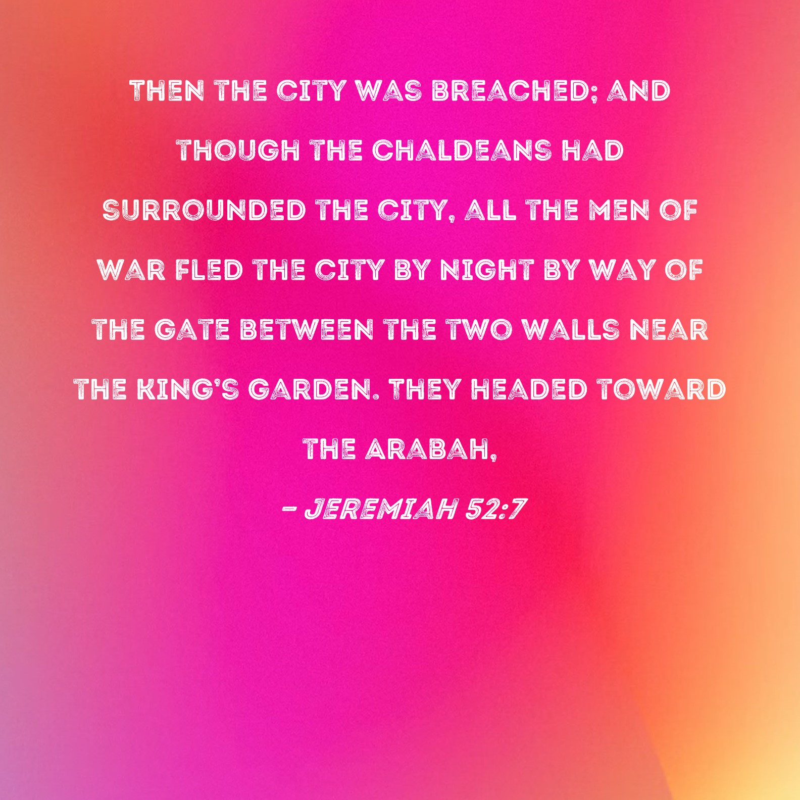 Jeremiah 52:7 Then the city was breached; and though the Chaldeans had surrounded the city, all the men of war fled the city by night by way of the gate between the two walls near the king's garden. They headed toward the Arabah,