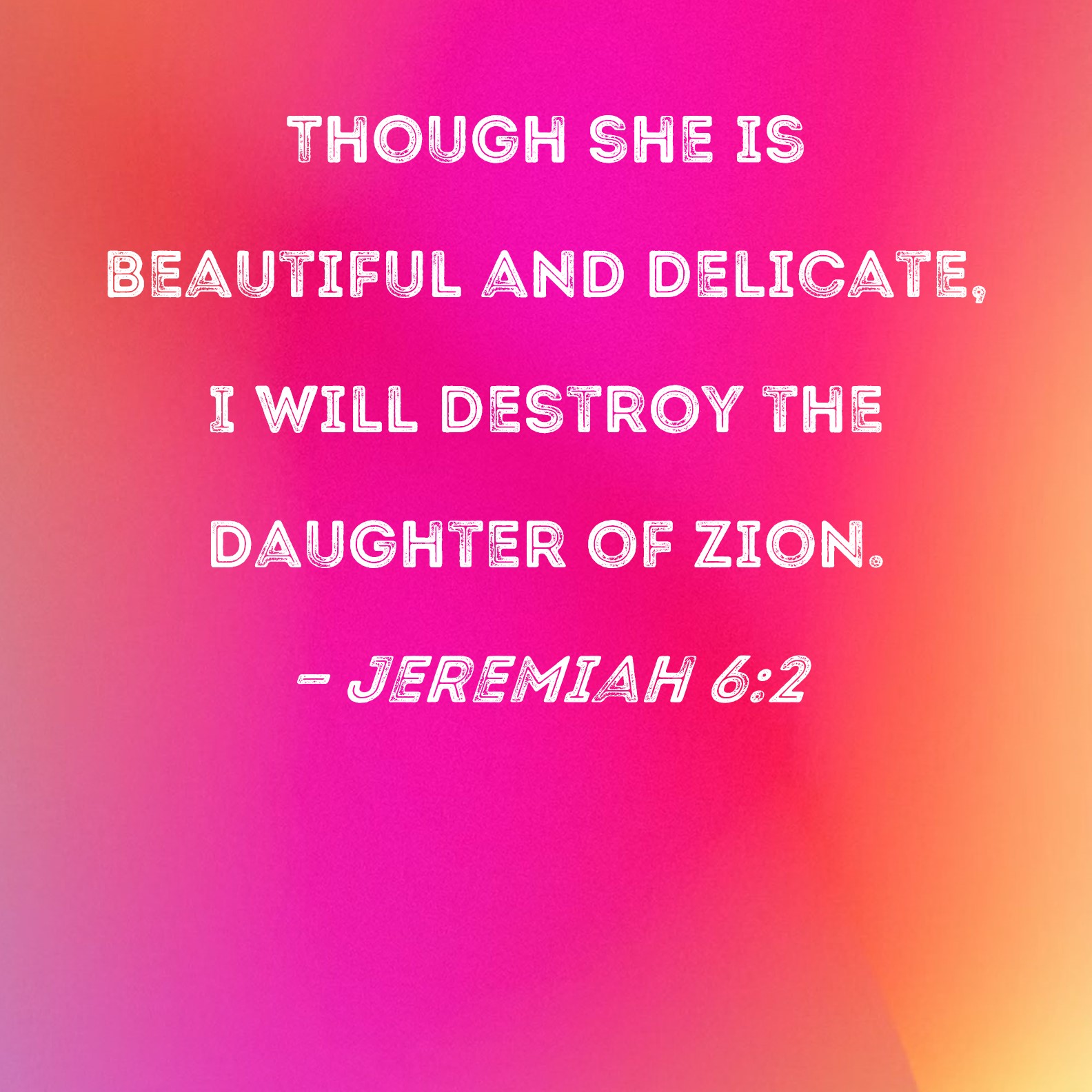 Jeremiah 6:2 Though she is beautiful and delicate, I will destroy the Daughter of Zion.